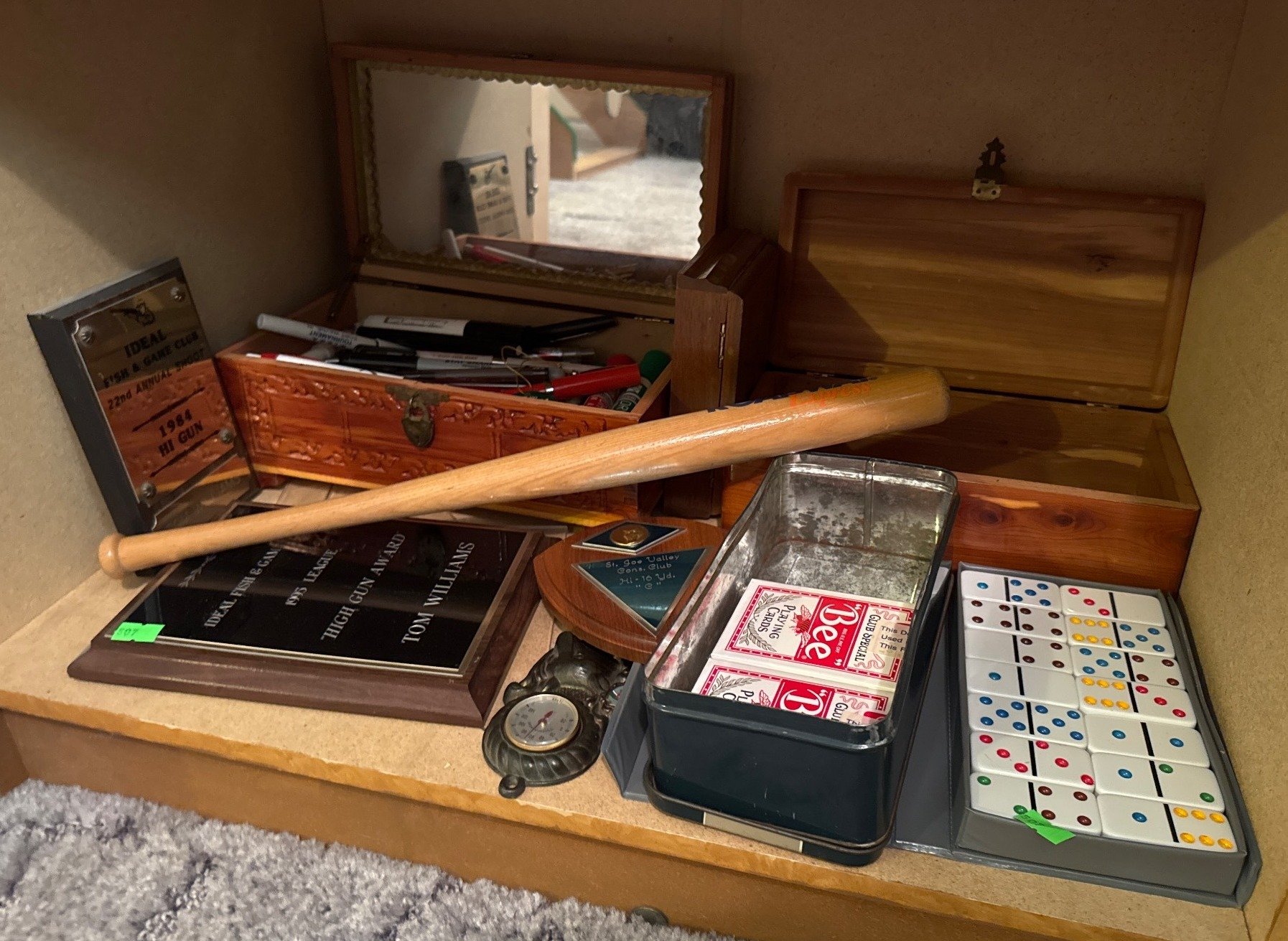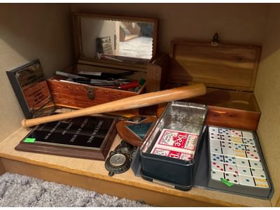 507 Game Pieces, Miniature Bat, Boxes, and Plaques