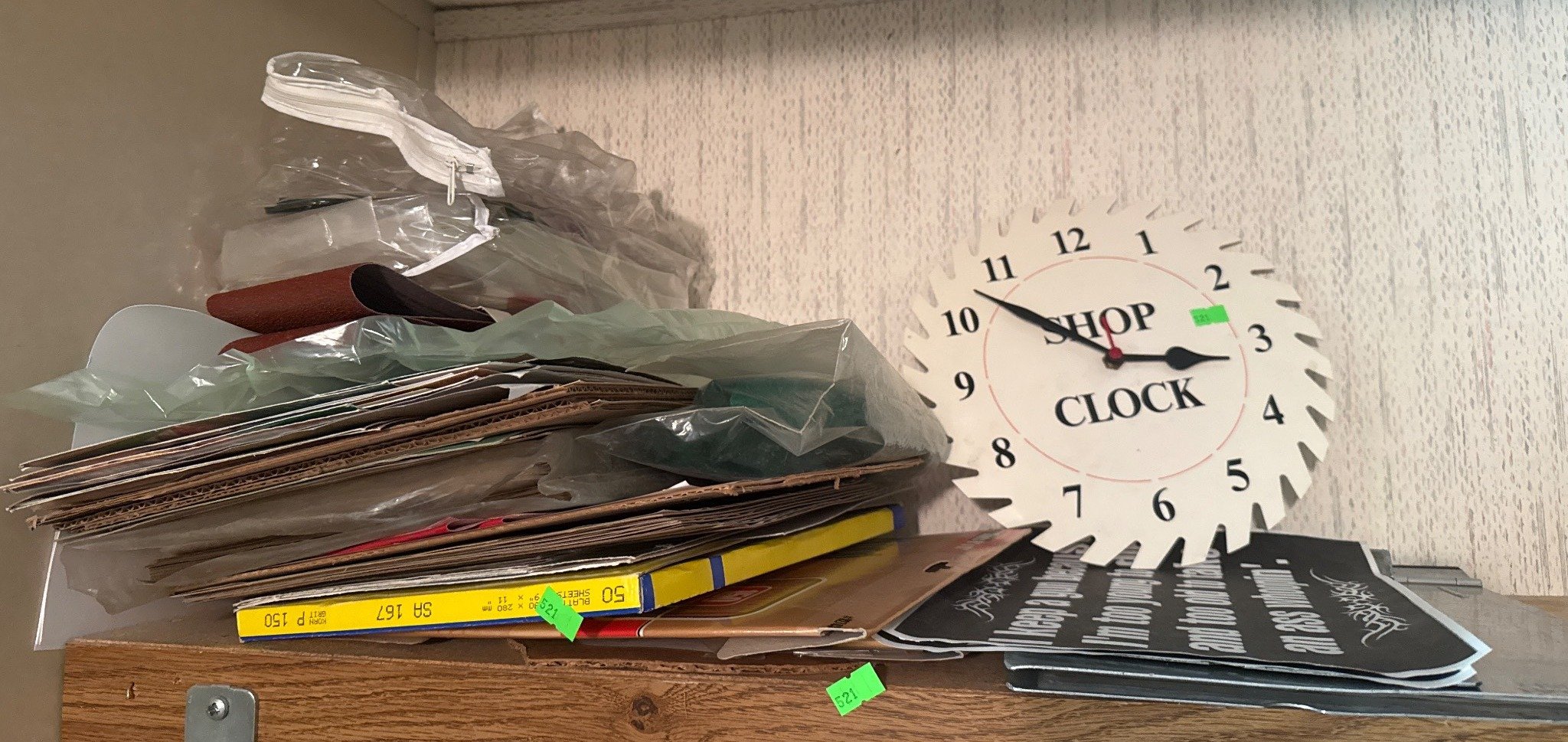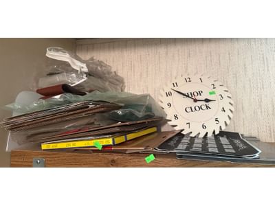 521 Metal Wall Clock with Sawblade Design and ‘Shop Clock’ Text and Other Items
