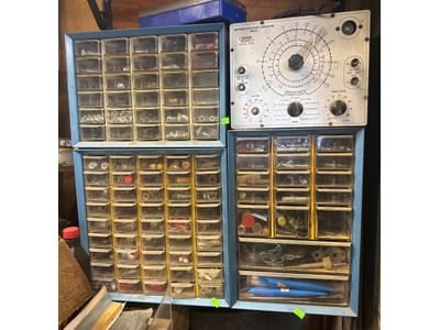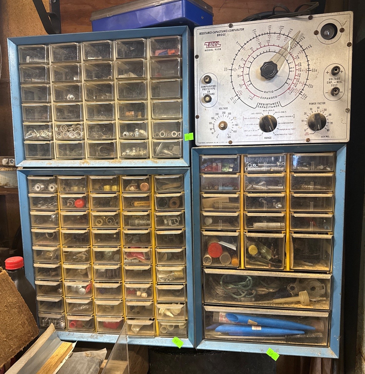68 Metal Cabinet with Plastic Drawers and Vintage Resistance Capacitance Comparator