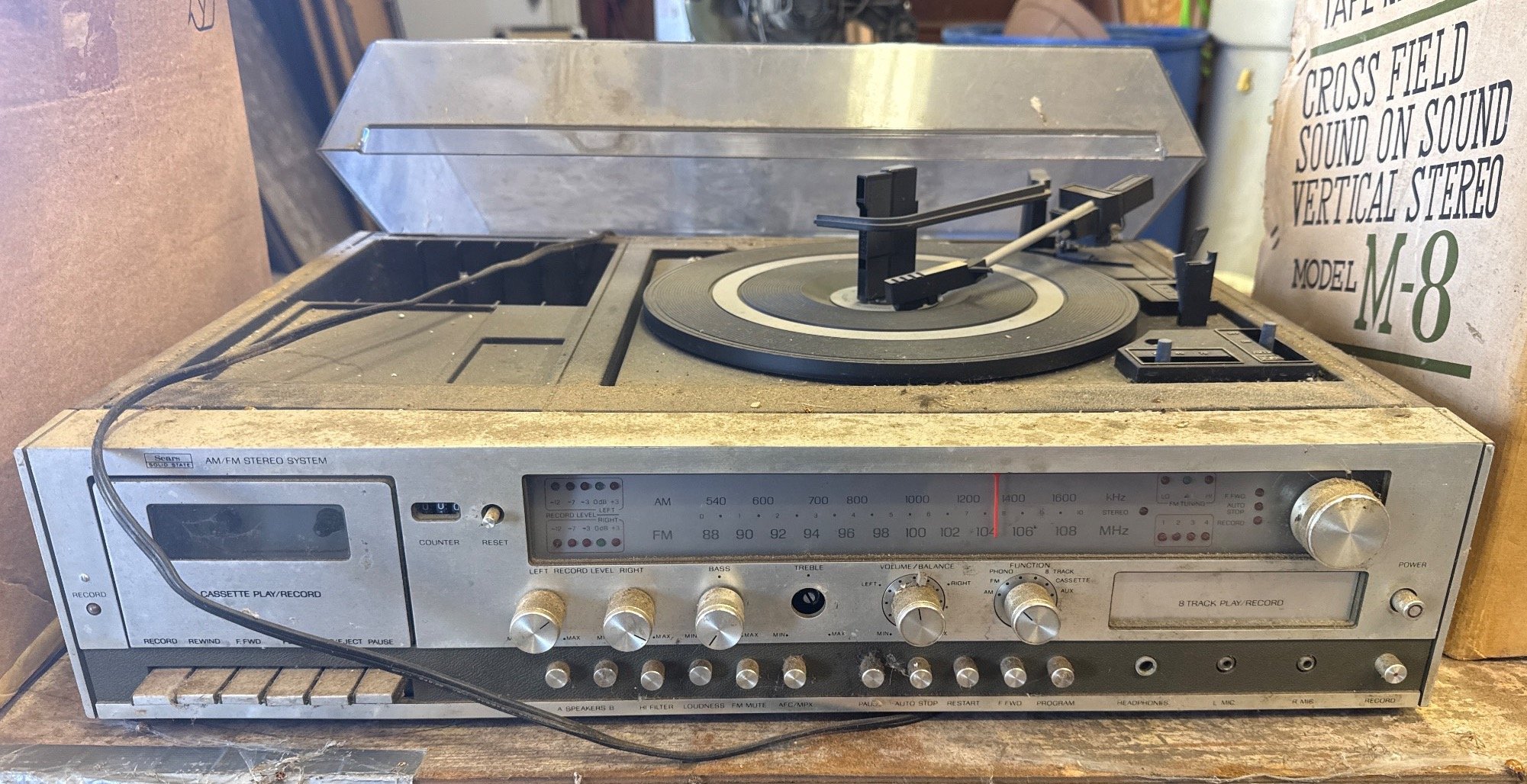32 Sears Solid State AM/FM Stereo System with Turntable, Cassette and 8-Track Player