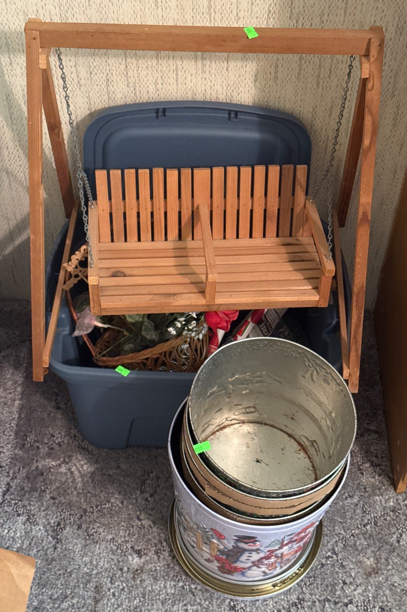 503 Miniature Swing-Style Plant Stand, Holiday-Themed Tins, and Plastic Bin with Artificial Florals
