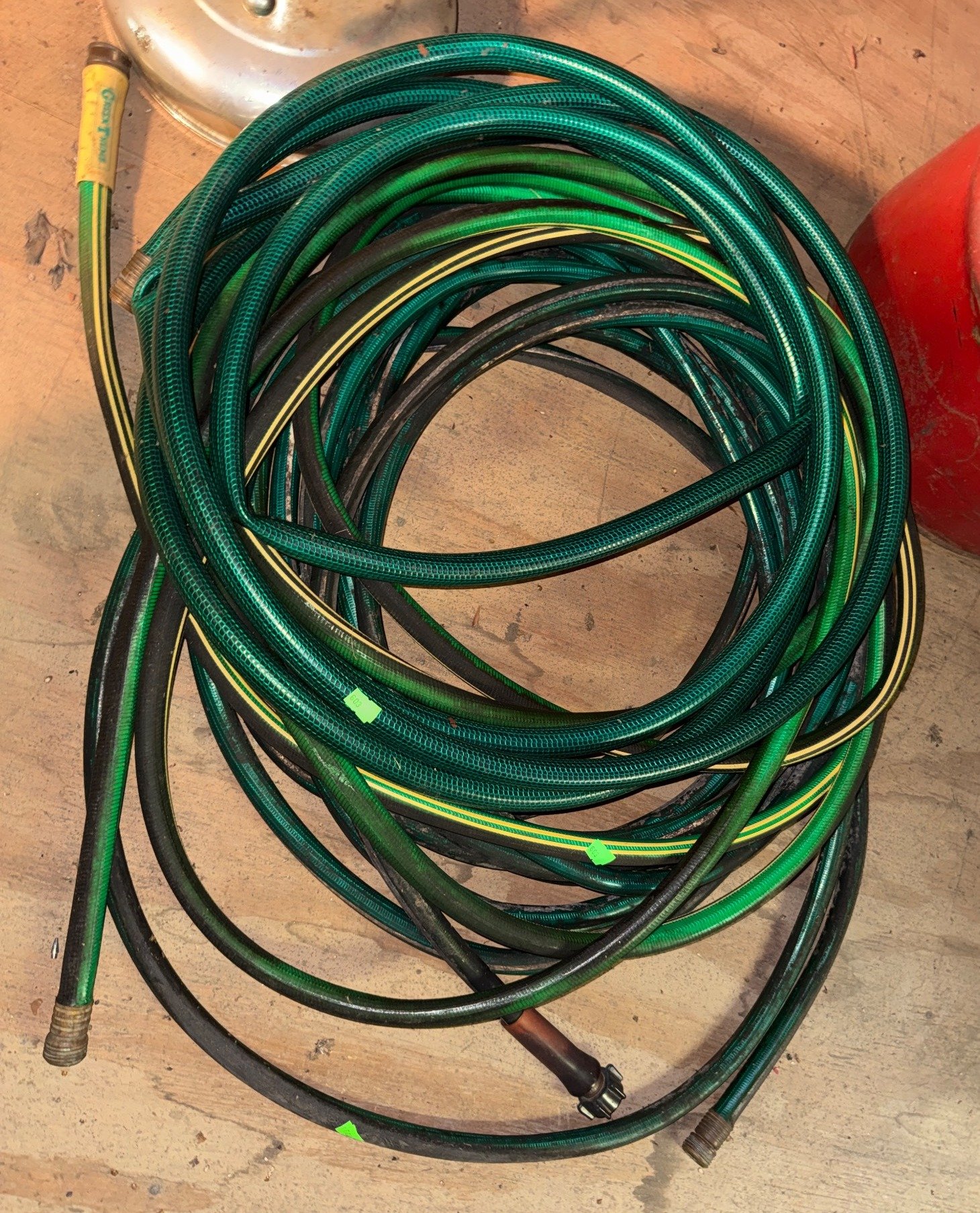 603 Coiled Green and Black Garden Hoses with Metal Fittings