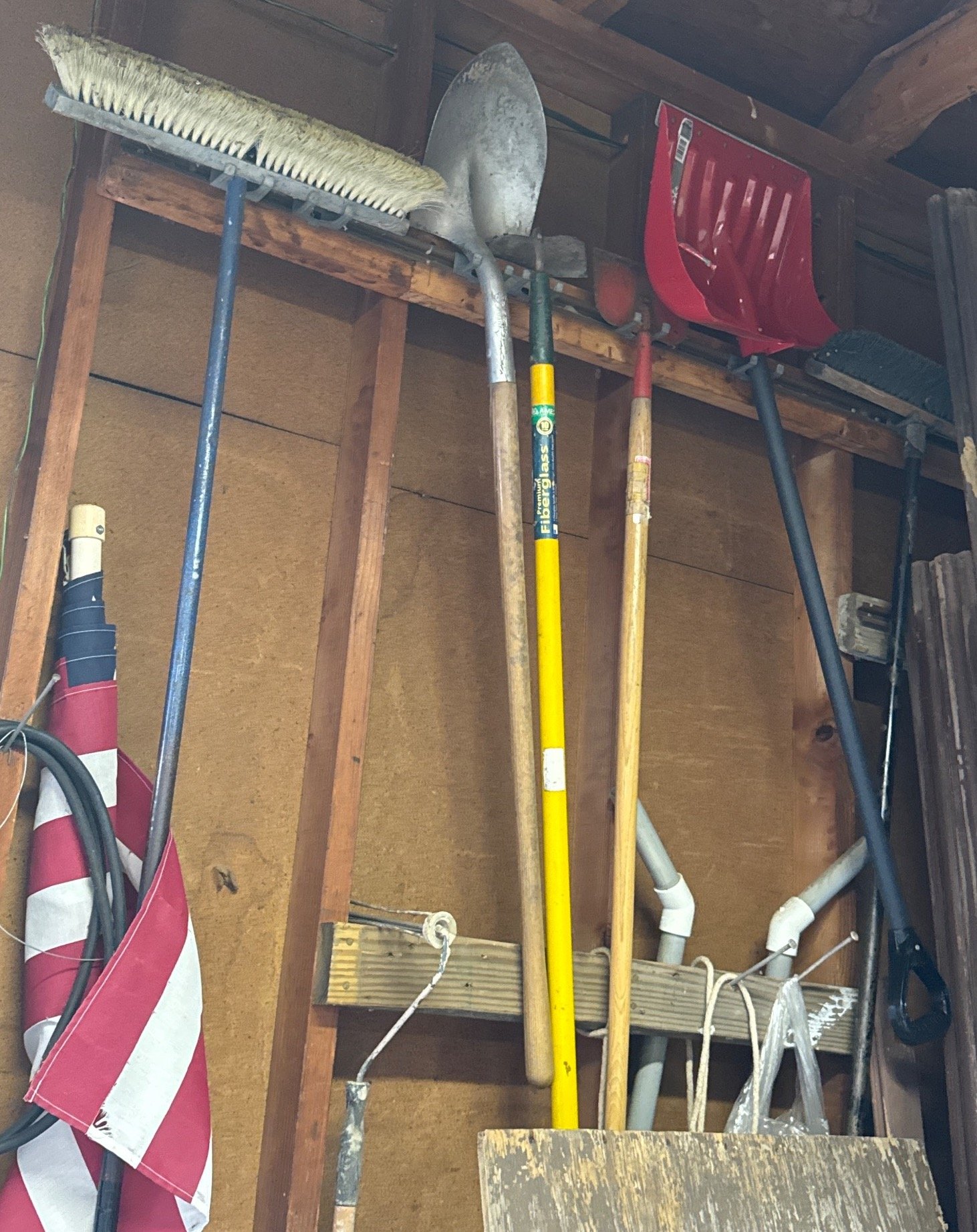 79 Yard Tools Including Broom, Shovels, and Snow Shovel