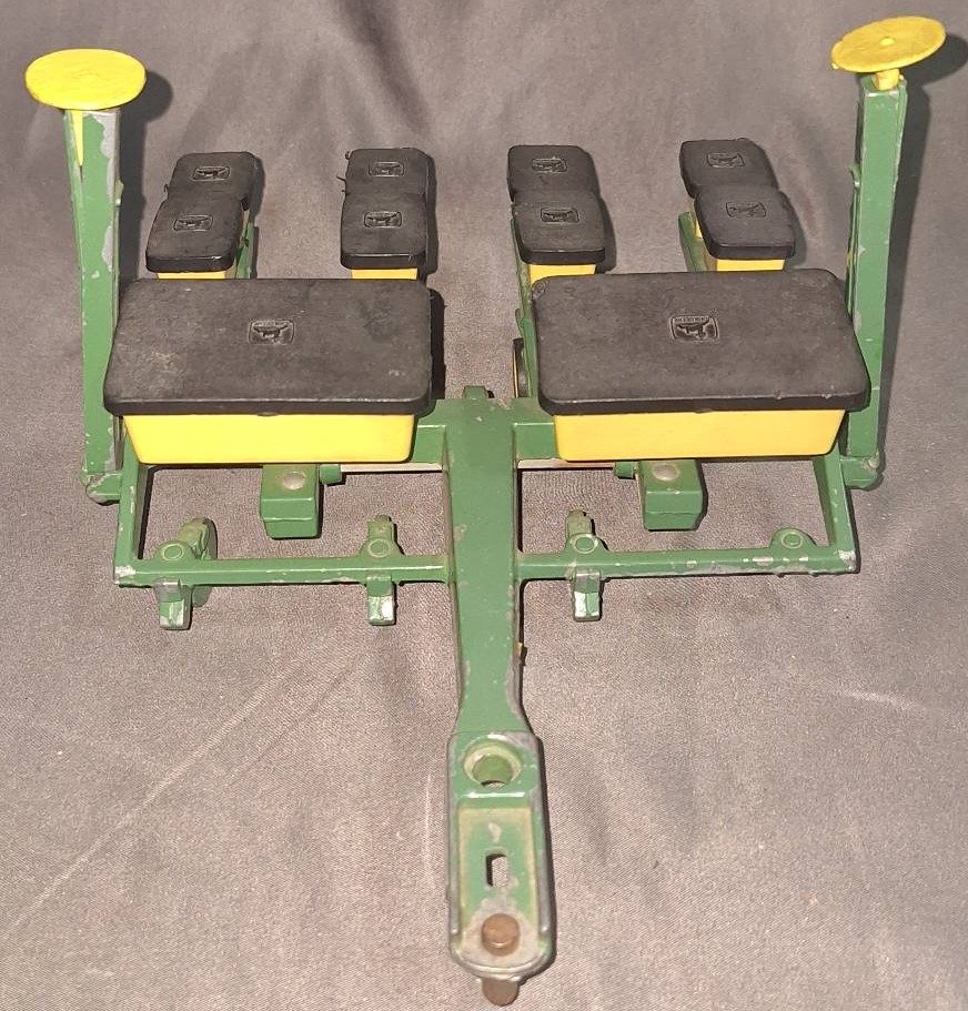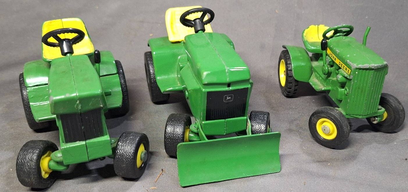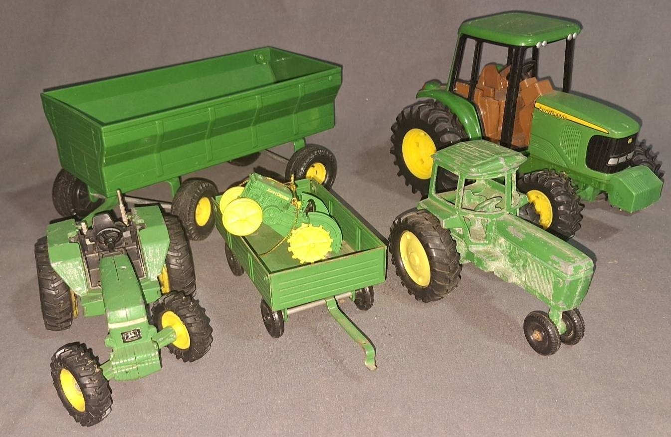 10696 2 John Deere Toy Tractors and 3 Farming Implements