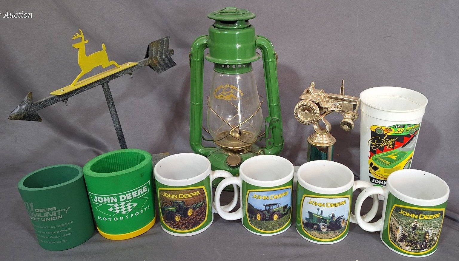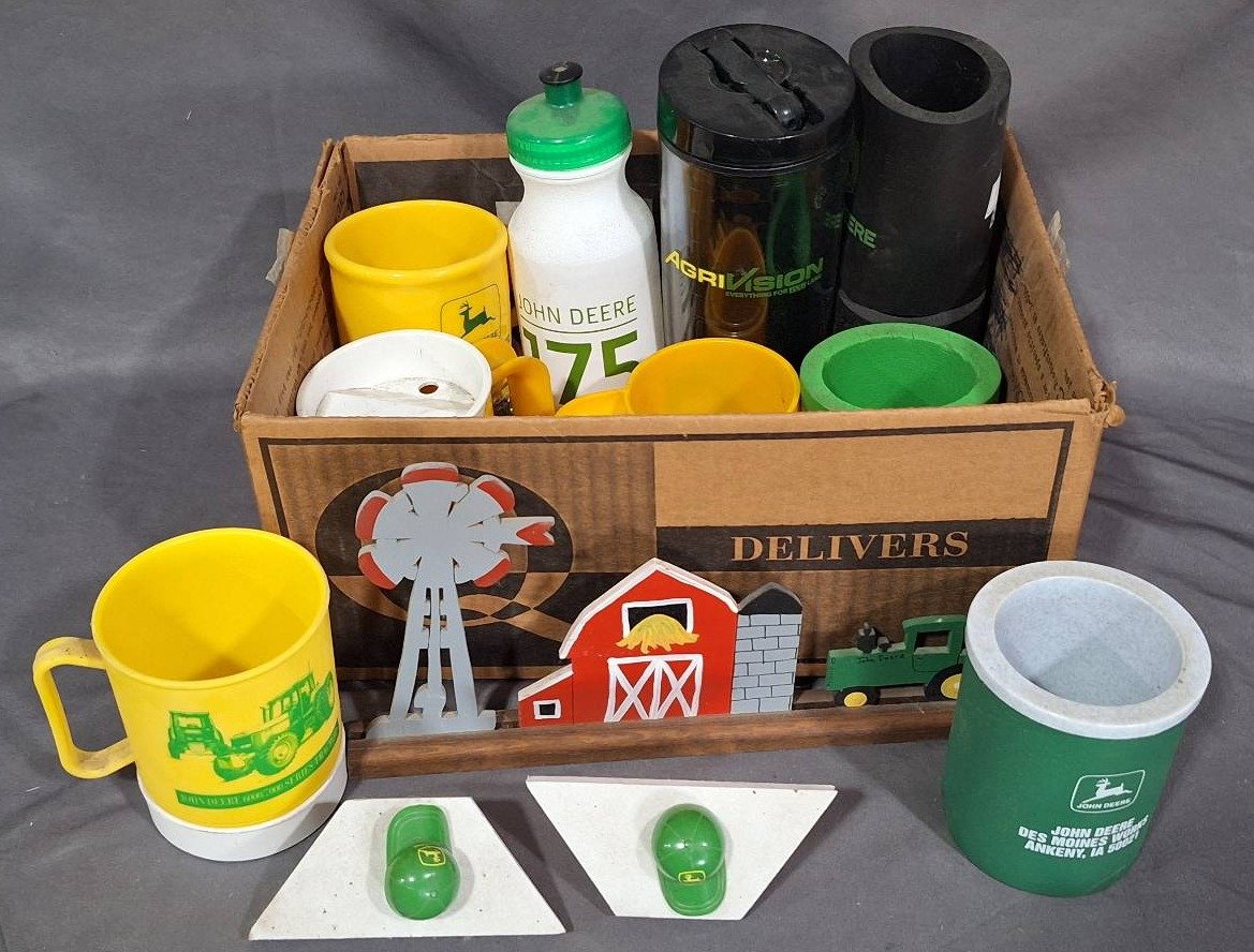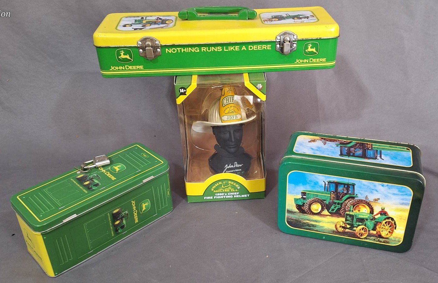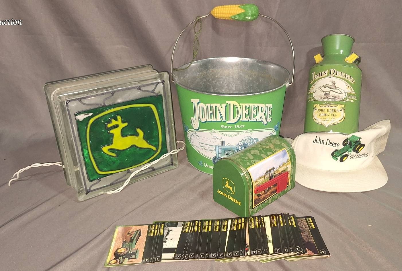 10668 John Deere Collectibles Including Tin Bucket, Thermos, Lamp, and Advertising Cards