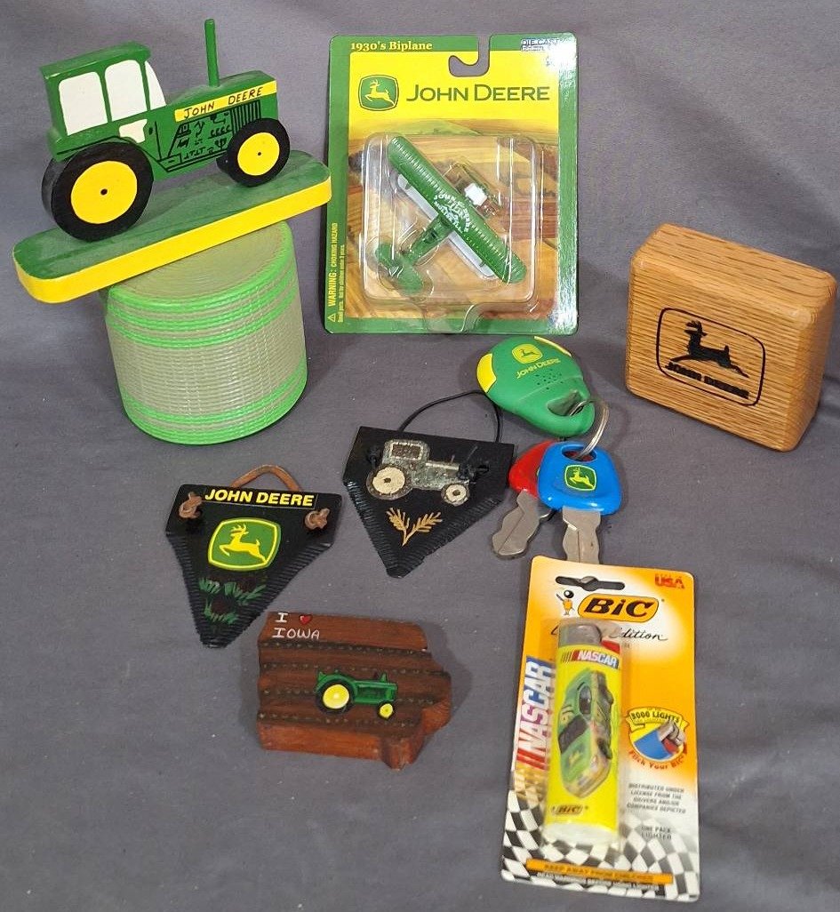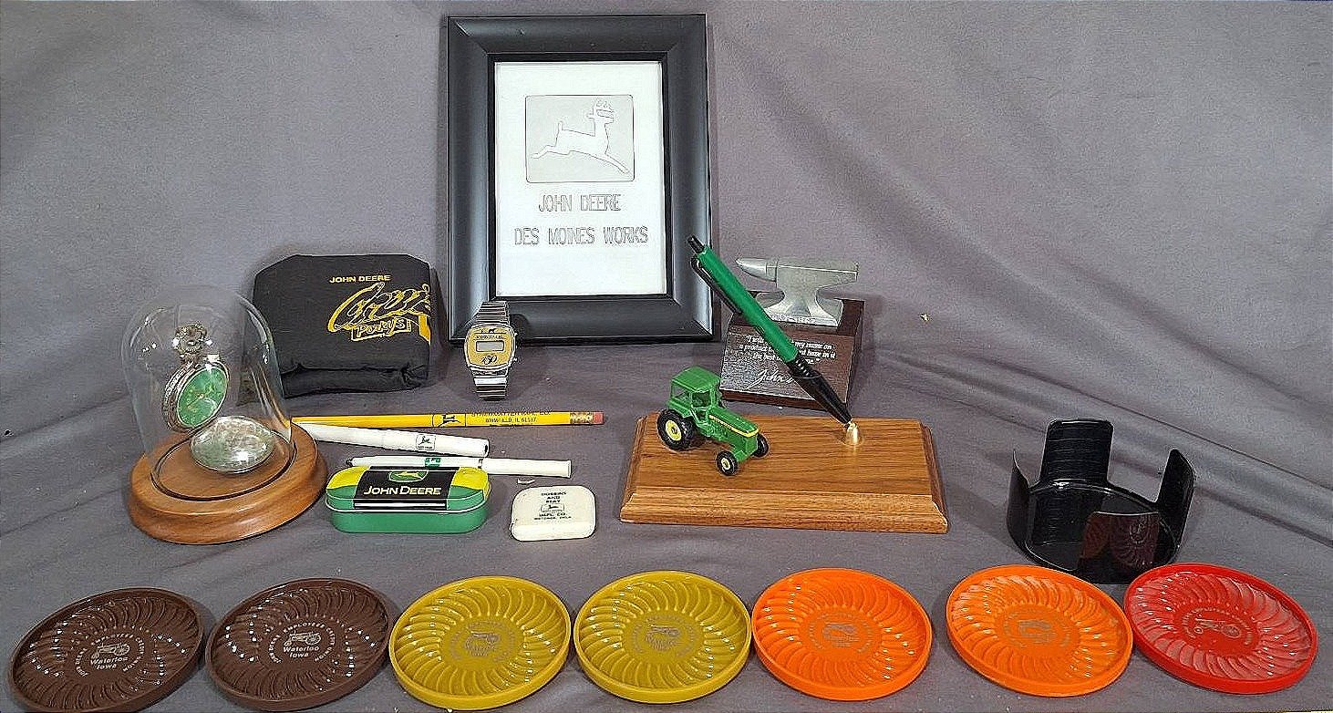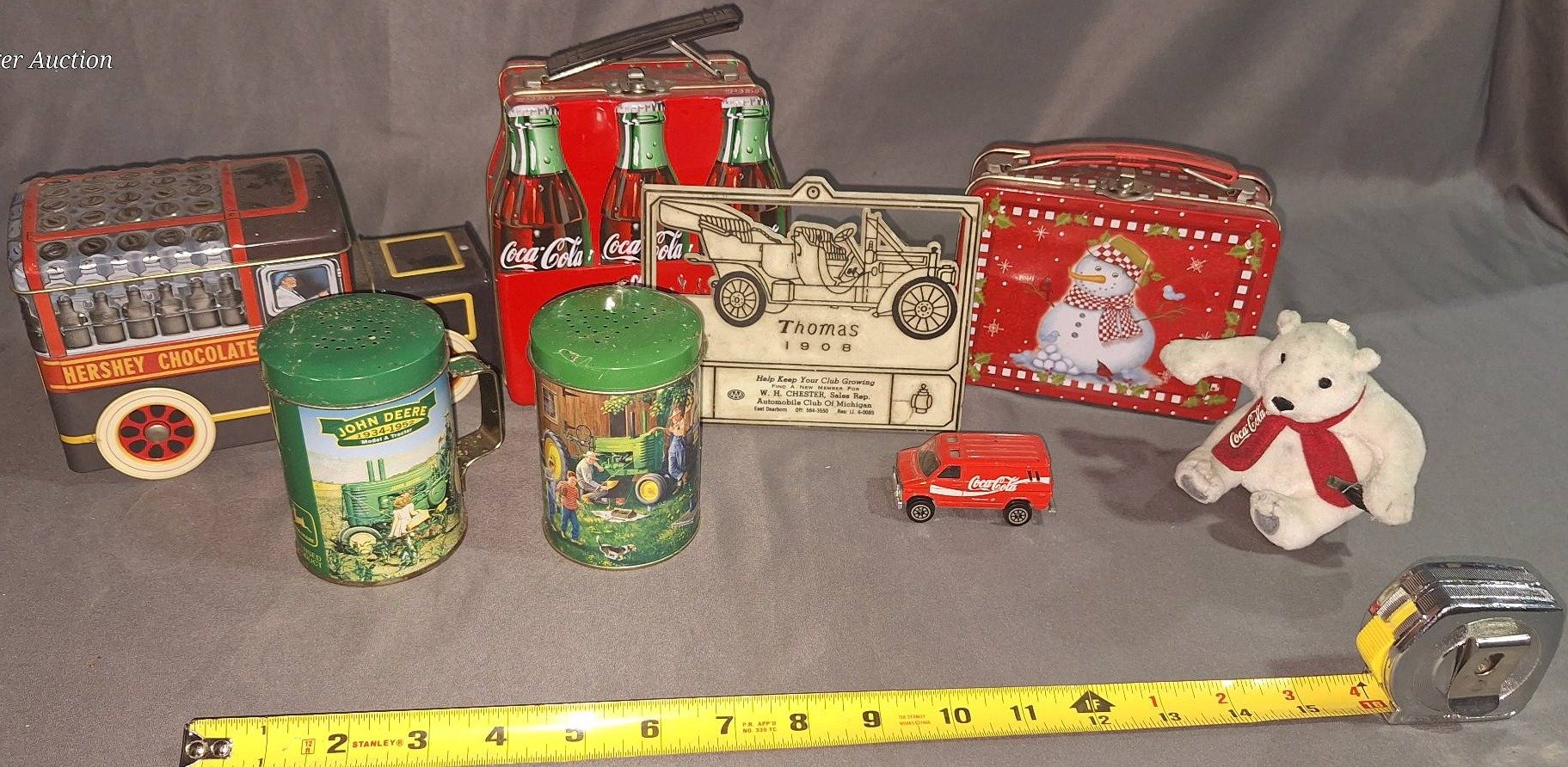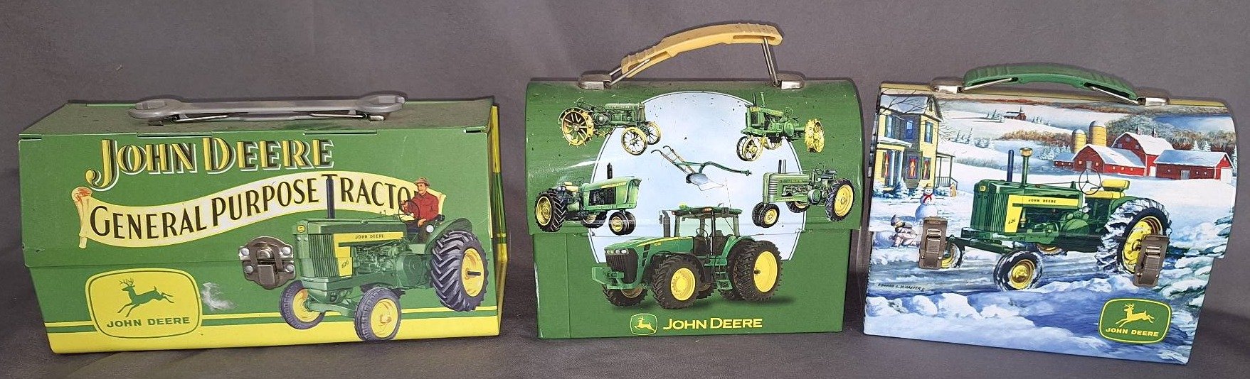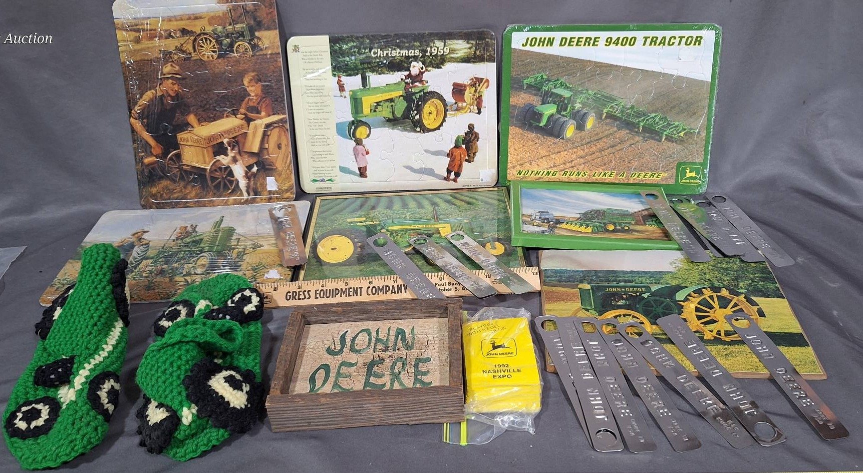 10668 John Deere Collectibles Including Tin Bucket, Thermos, Lamp, and Advertising Cards