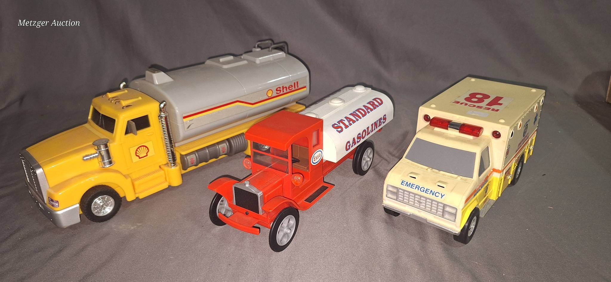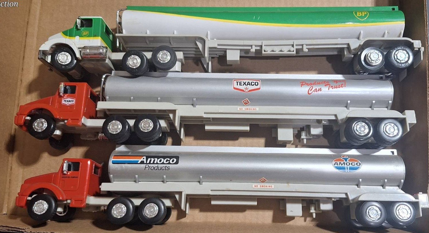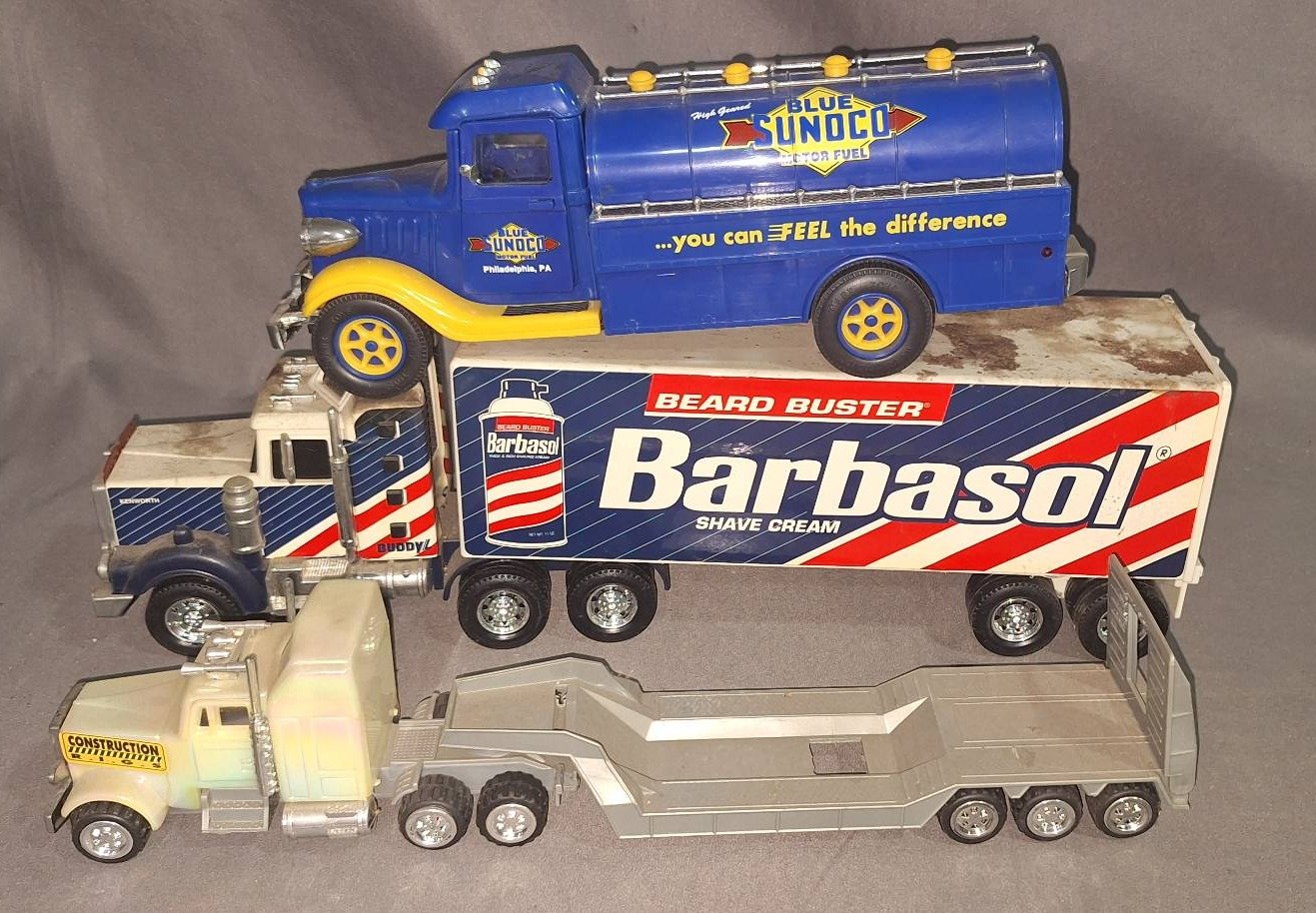 10686 Plastic Toy Trucks Including Tanker, Barbasol Trailer, and Flatbed Hauler