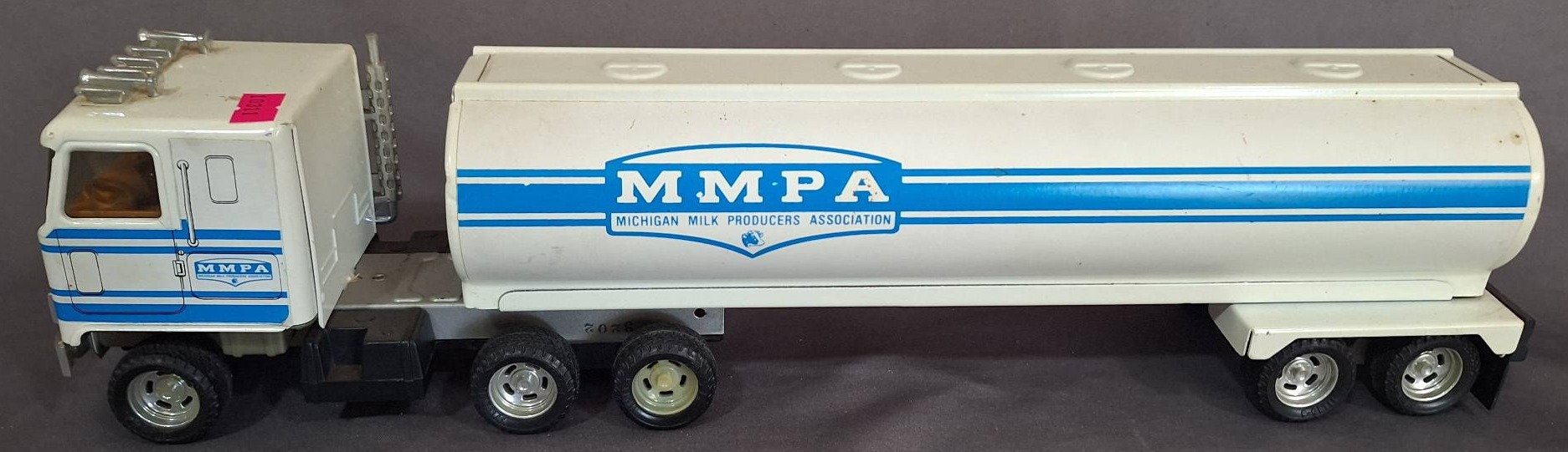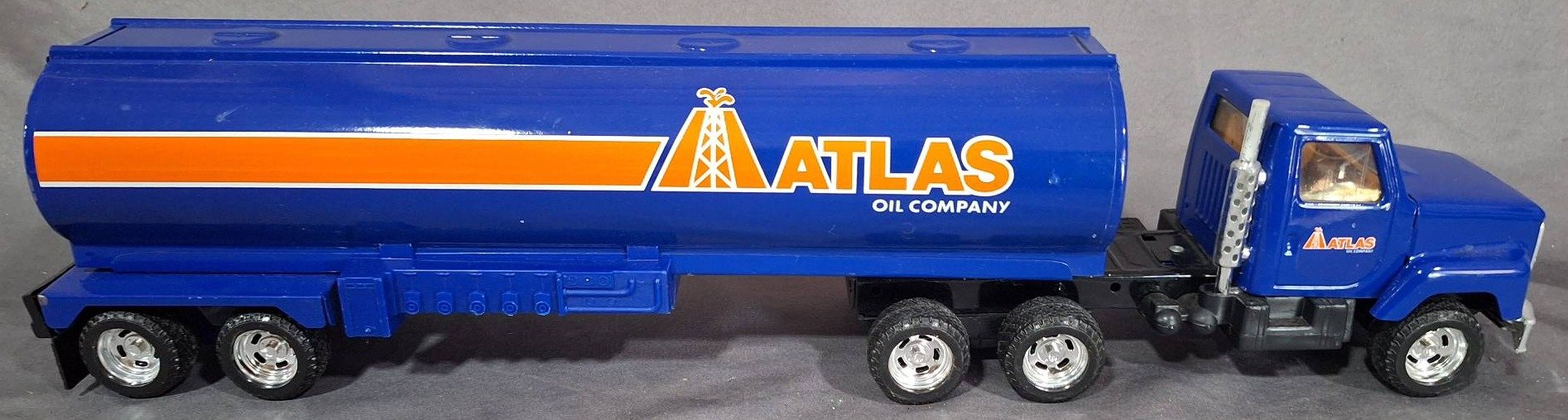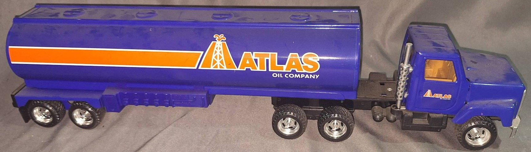 10686 Plastic Toy Trucks Including Tanker, Barbasol Trailer, and Flatbed Hauler