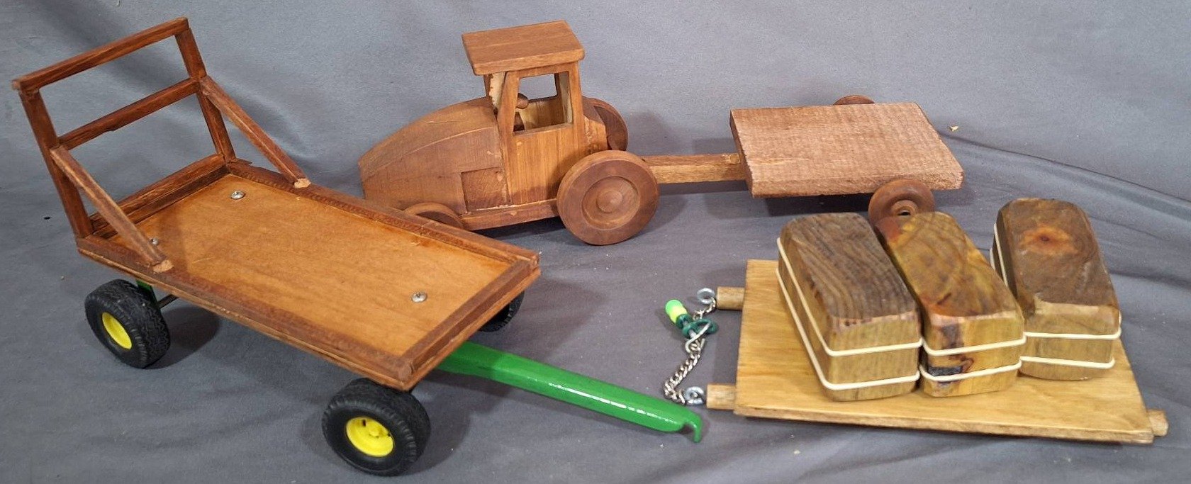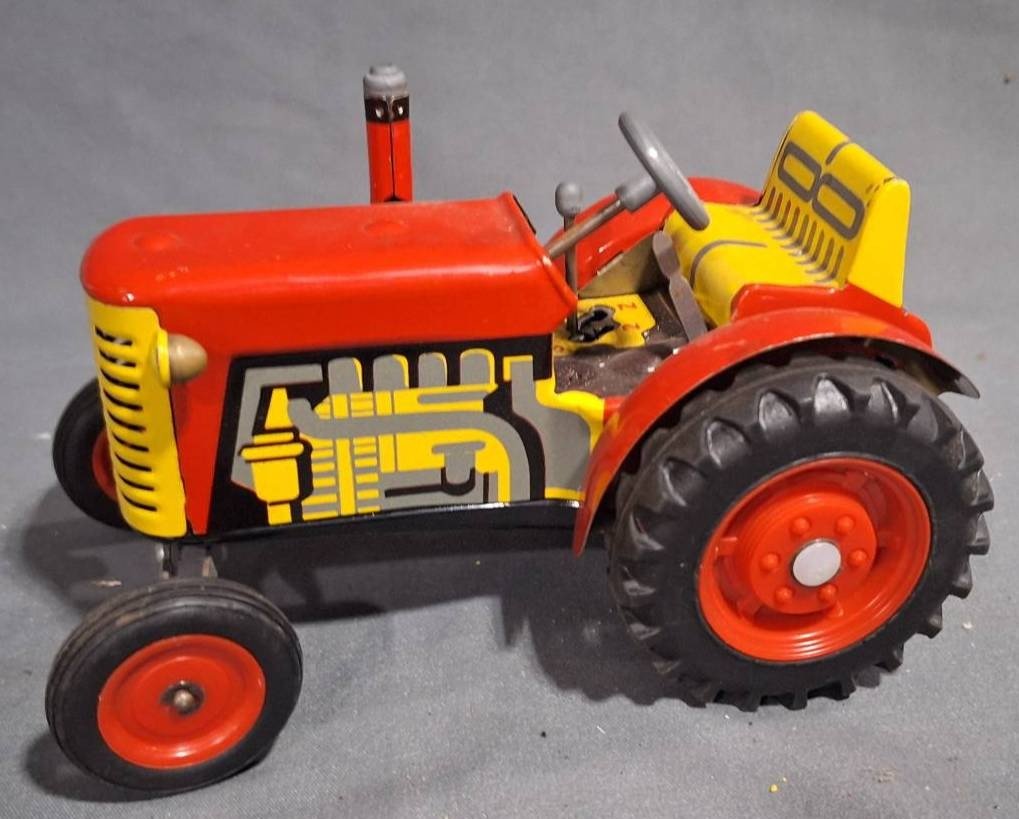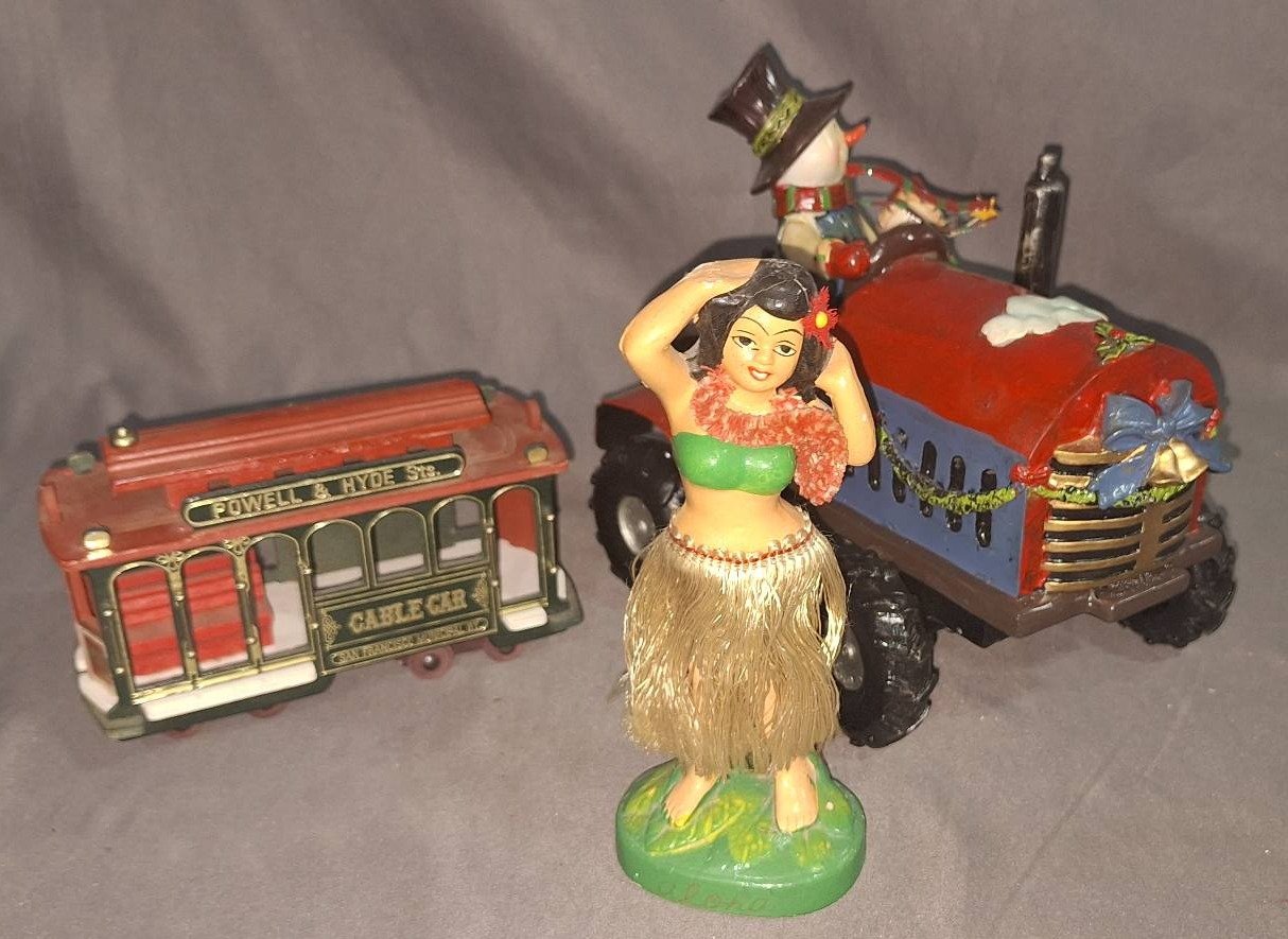 10706 3 Items: Tin Tractor, Trolley Car, and Hula Girl Figurine
