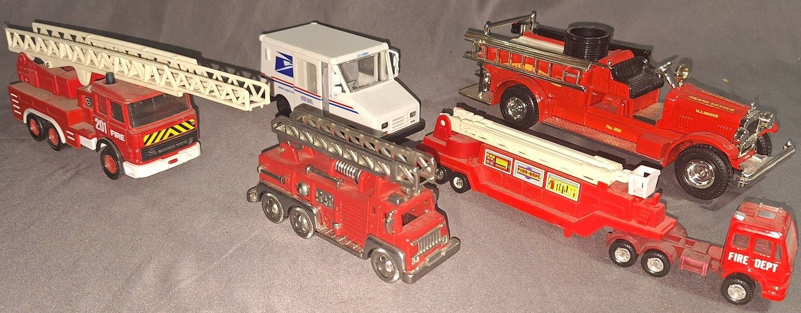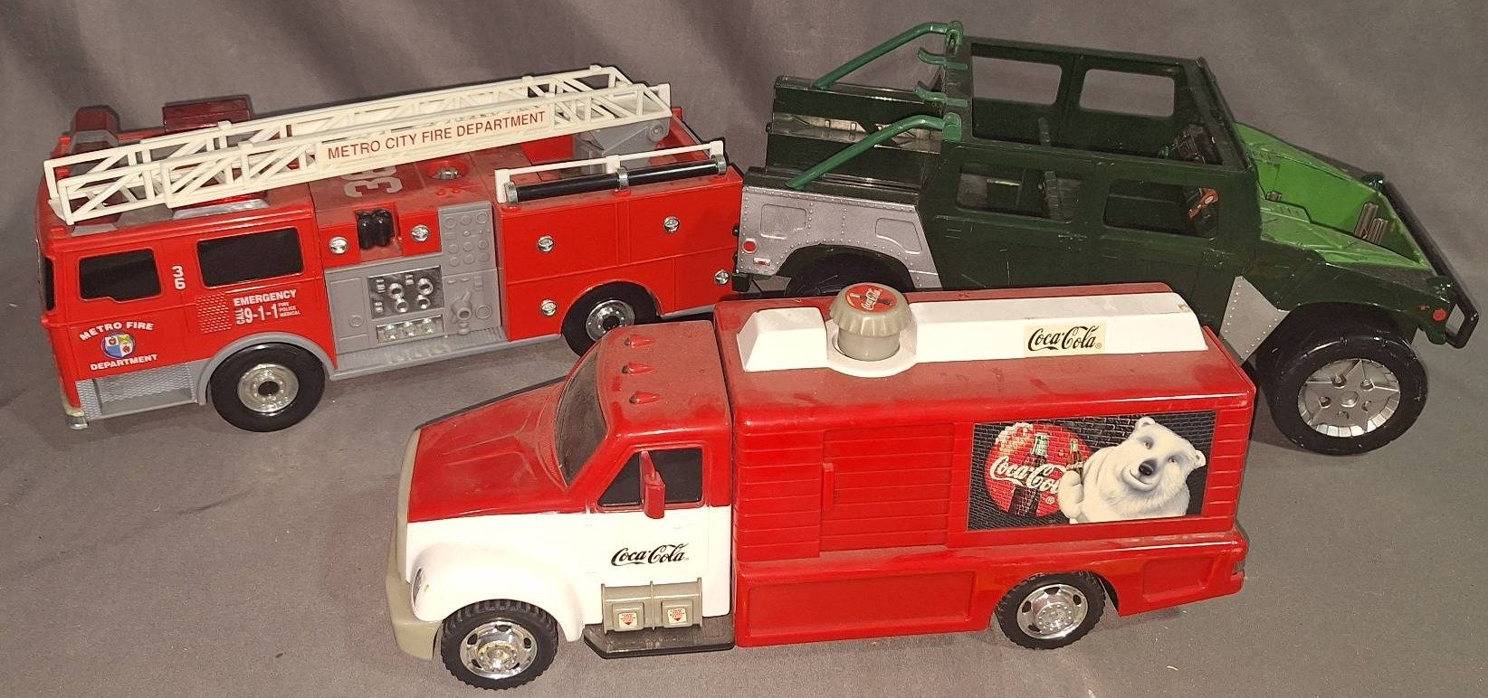 10708 Plastic Toy Vehicles Inc. Fire Truck, Coca-Cola Truck, and Off-Road Vehicle