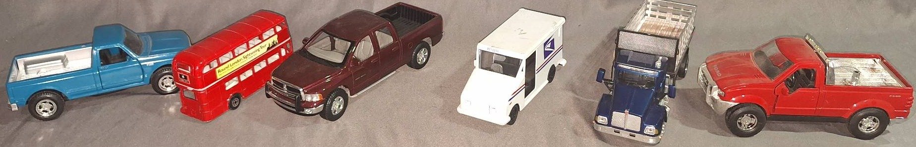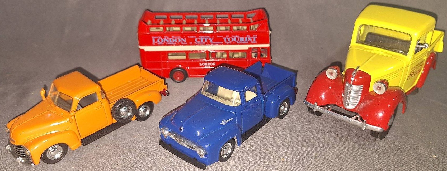10635 Die-Cast Model Vehicles Inc. Double-Decker Bus and Pickup Trucks