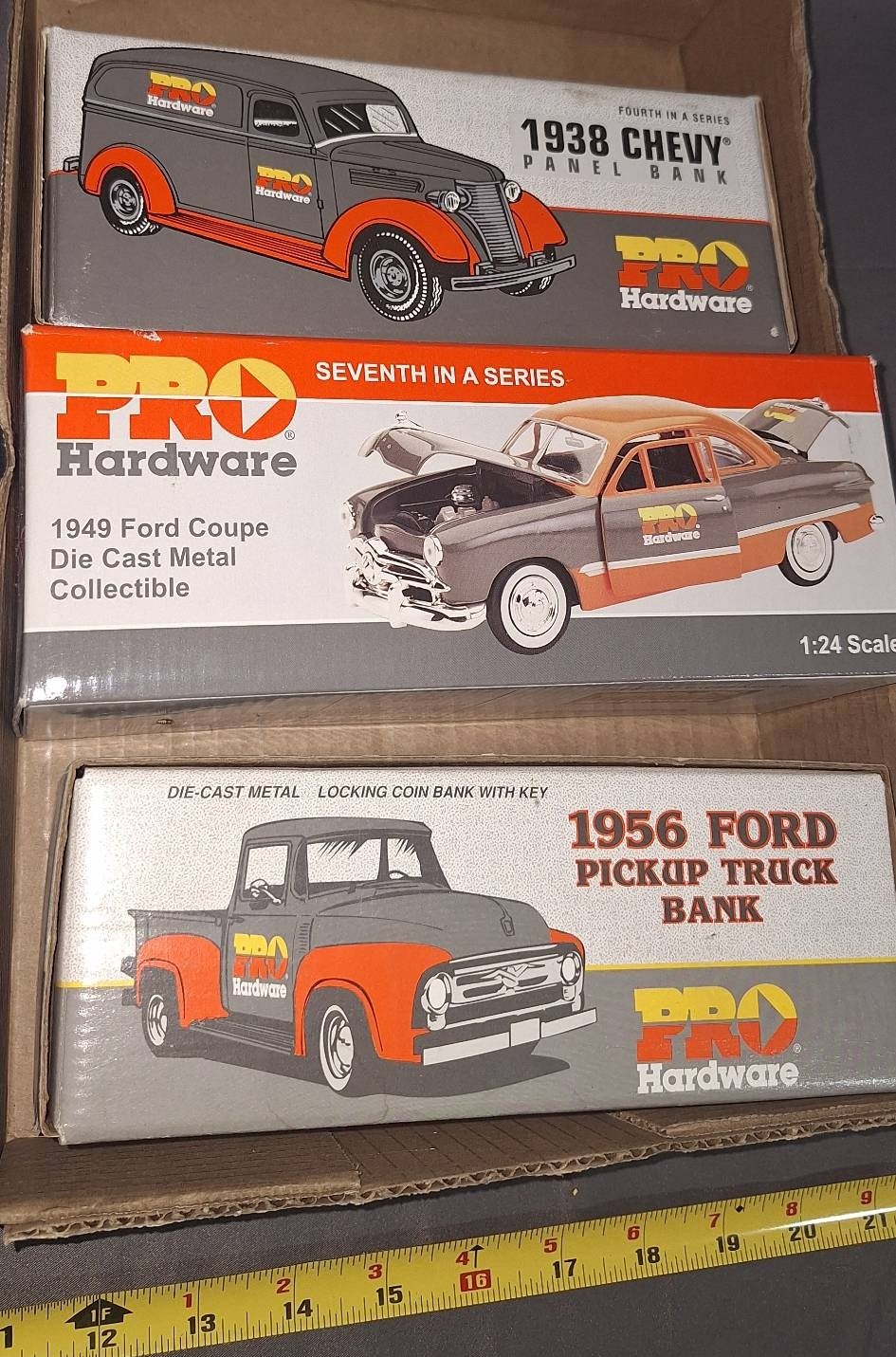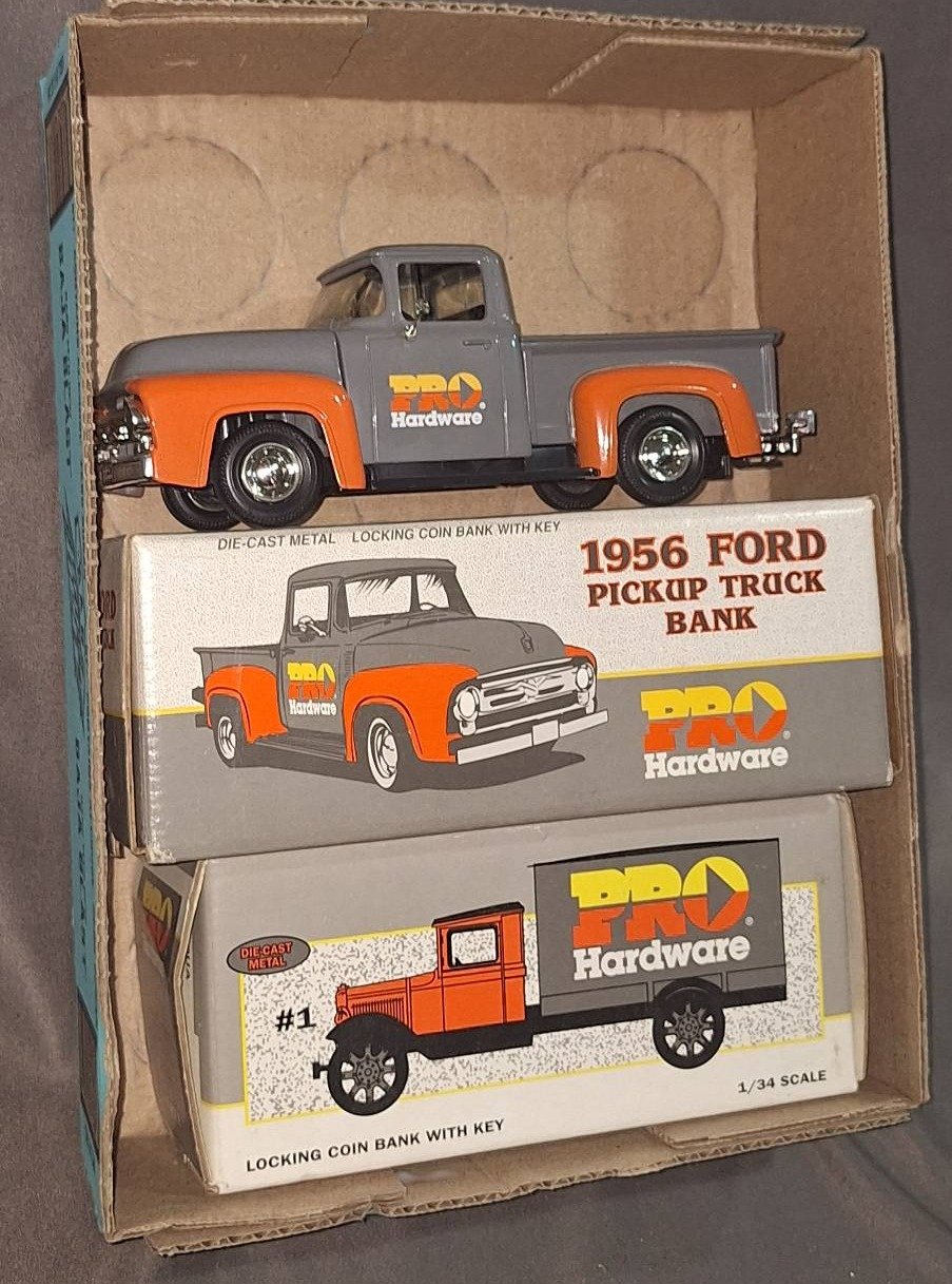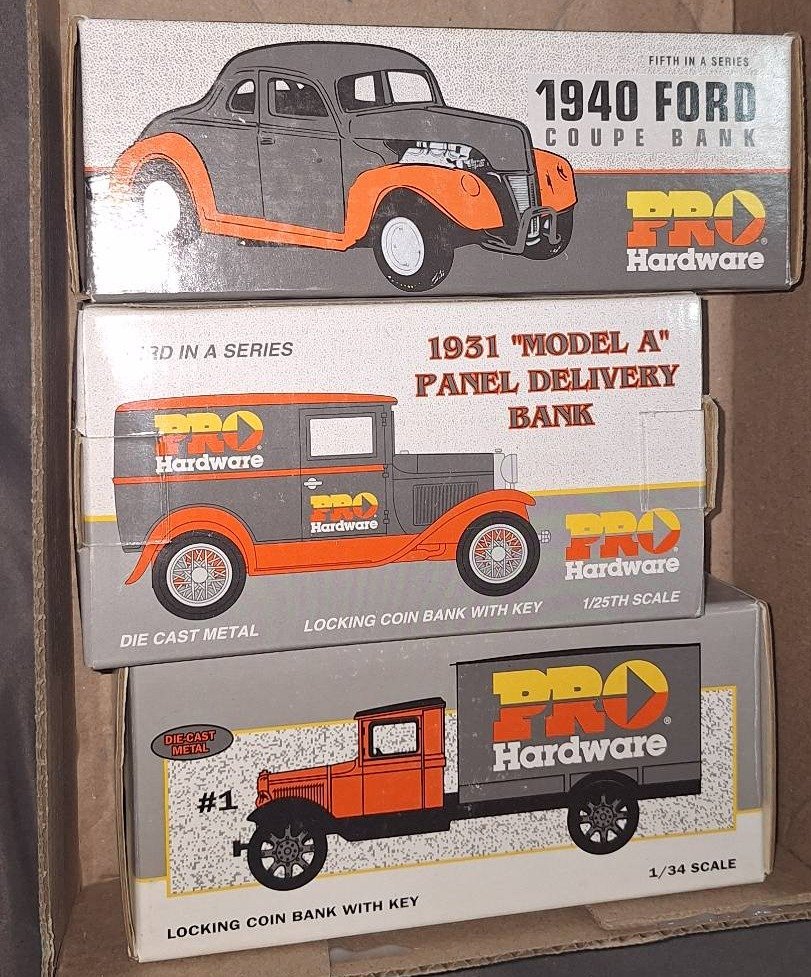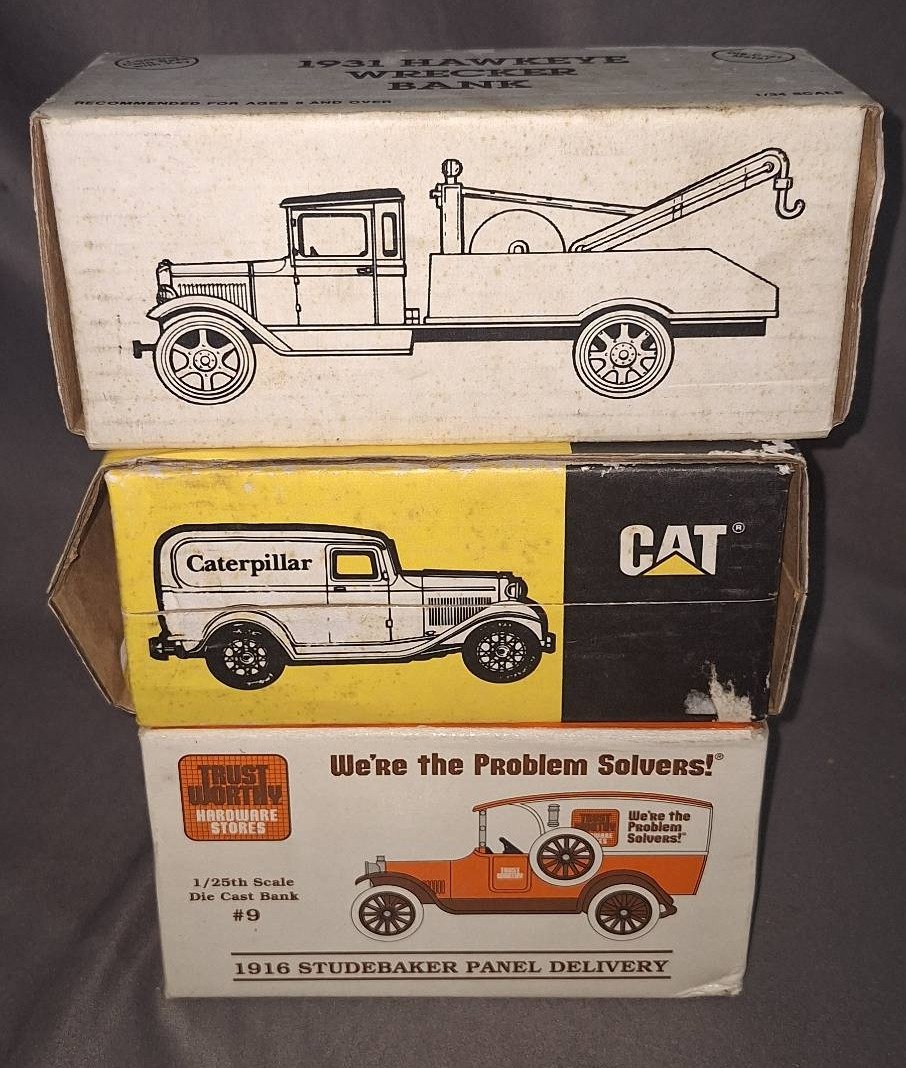 10673 3 Truck Banks in Original Boxes, Inc. 1931 Hawkeye, Mack Wrecker, and 1925 Ford