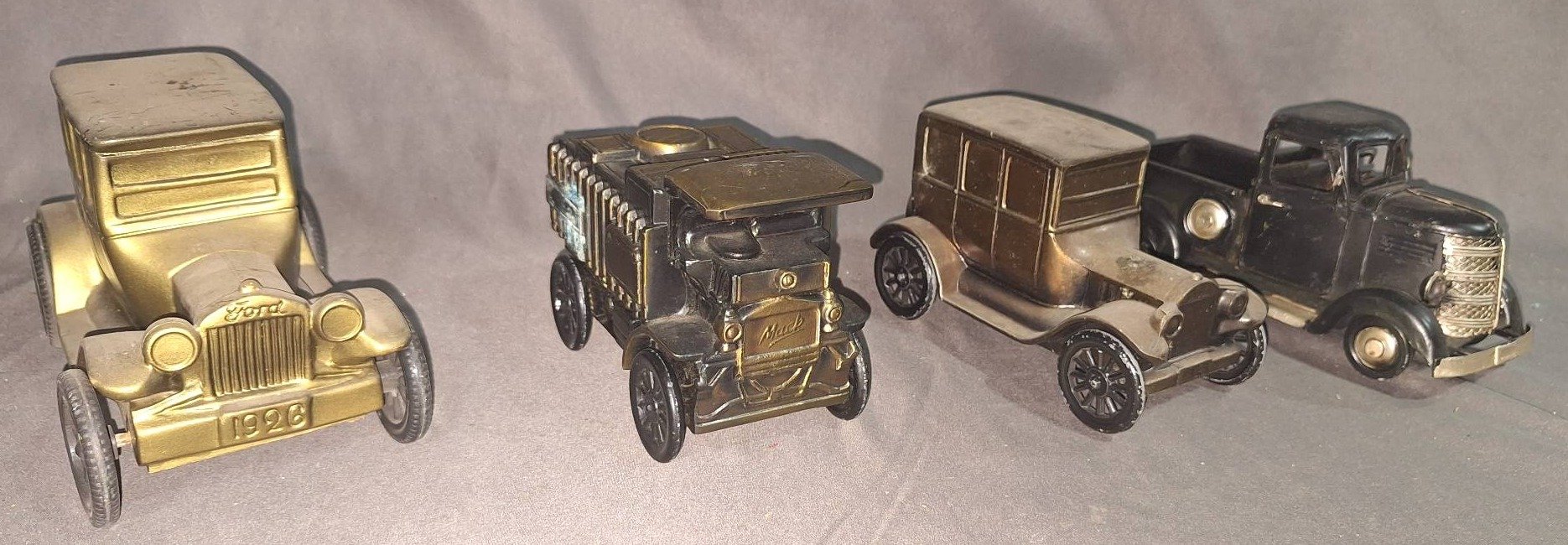 10710 4 Vehicle Coin Banks: 2 Bronze-Tone Trucks, 1 Gold-Tone Plastic, 1 Metal Pickup