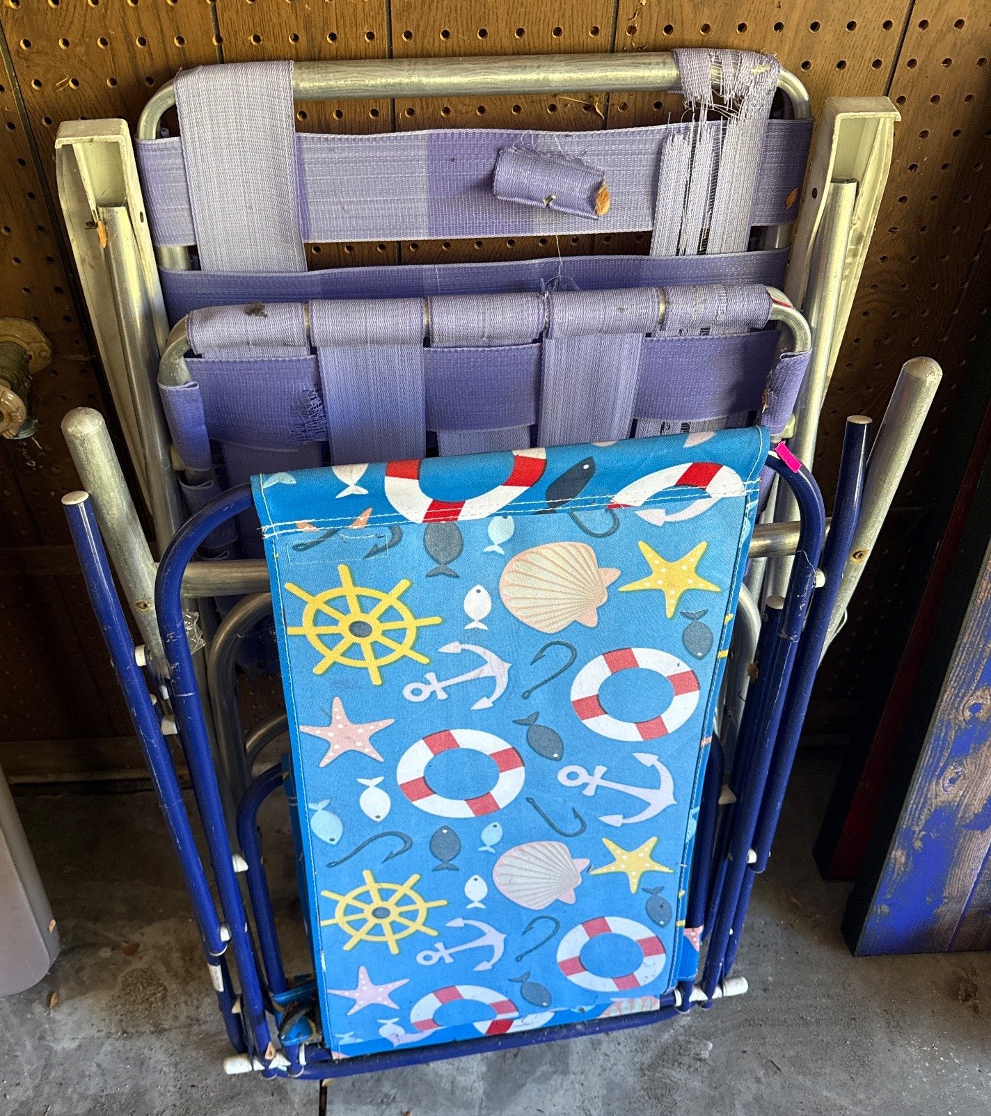 1004 Folding Metal Chairs with Woven Straps and Nautical-Themed Fabric