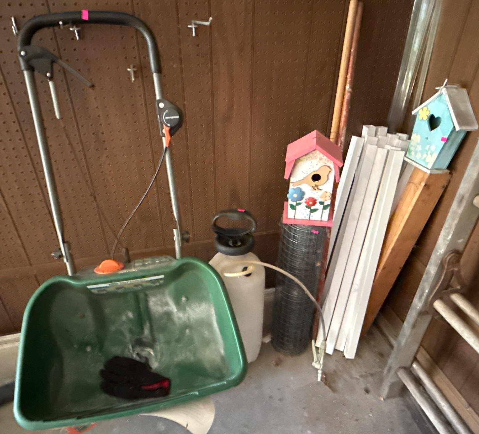 1015 Scotts Deluxe EdgeGuard Spreader, Birdhouses, Wire Fencing, and Miscellaneous Garden Tools