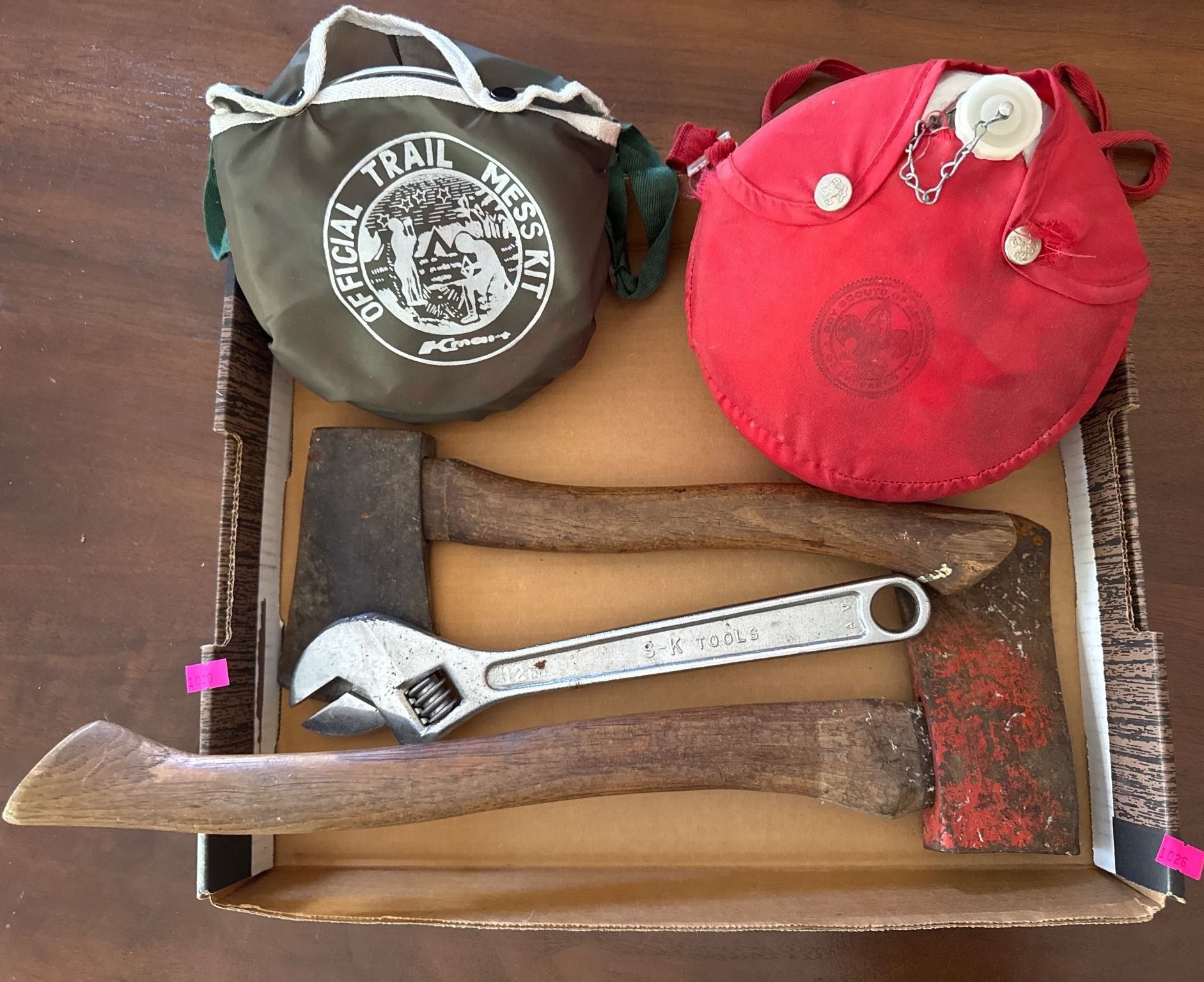 1026 Two Hatchets, Adjustable Wrench, Official Trail Mess Kit, and Boy Scouts of America Canteen