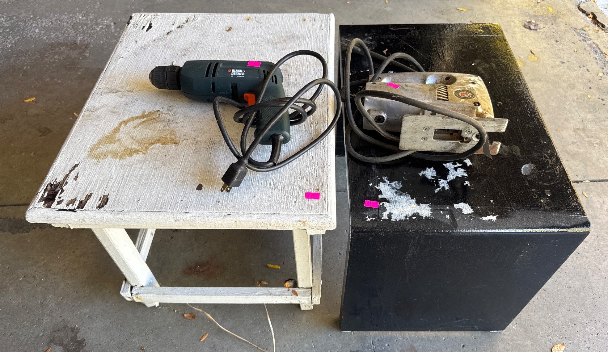 1031 Black & Decker Drill, Rockwell Jigsaw, and 2 Painted Tables