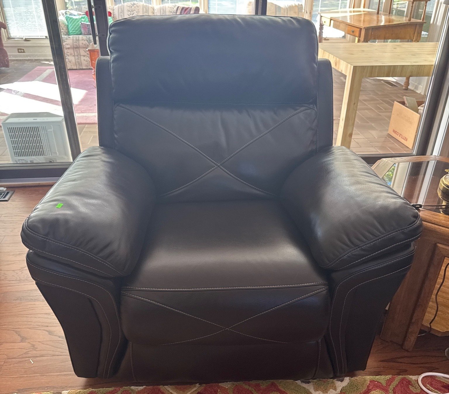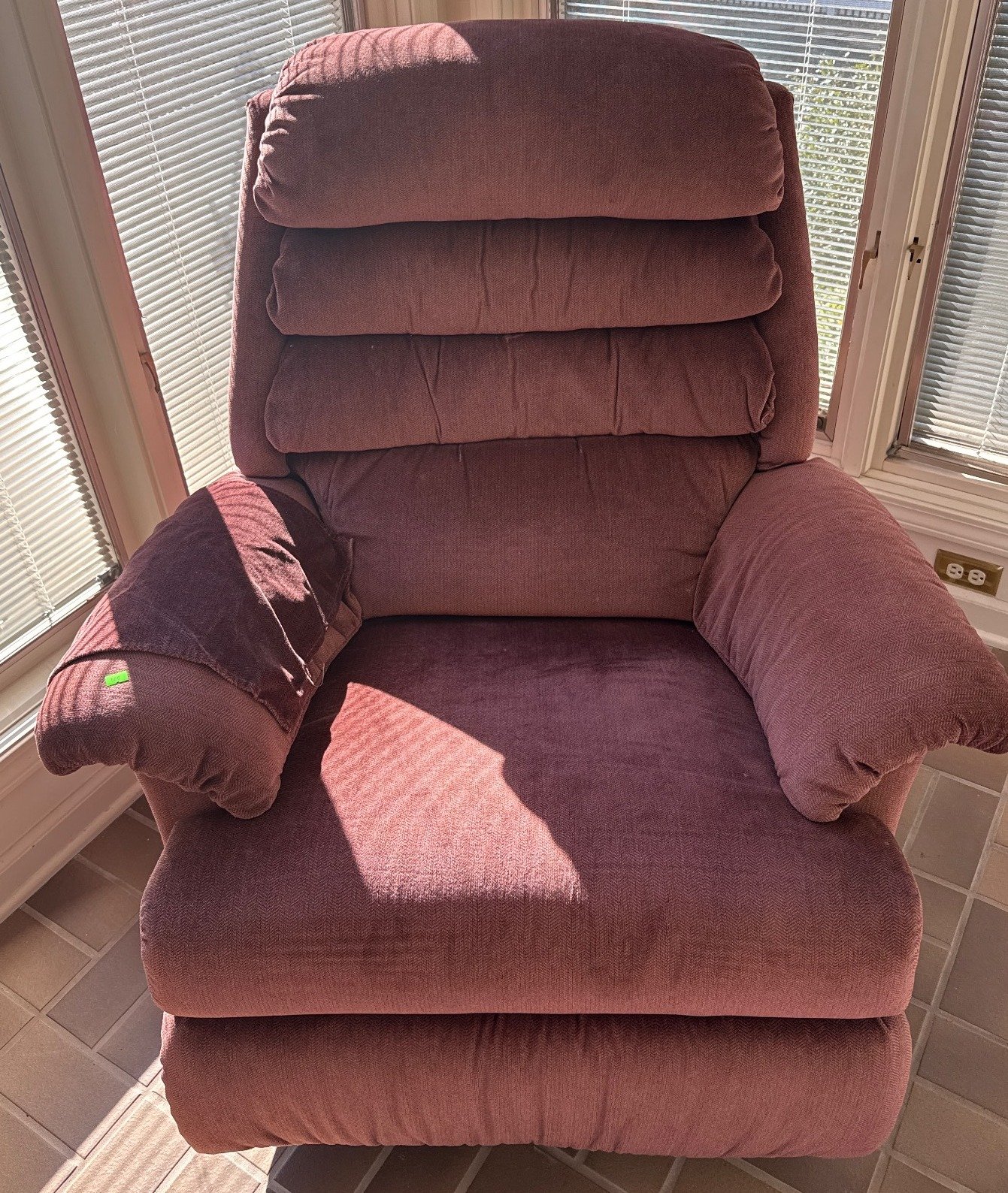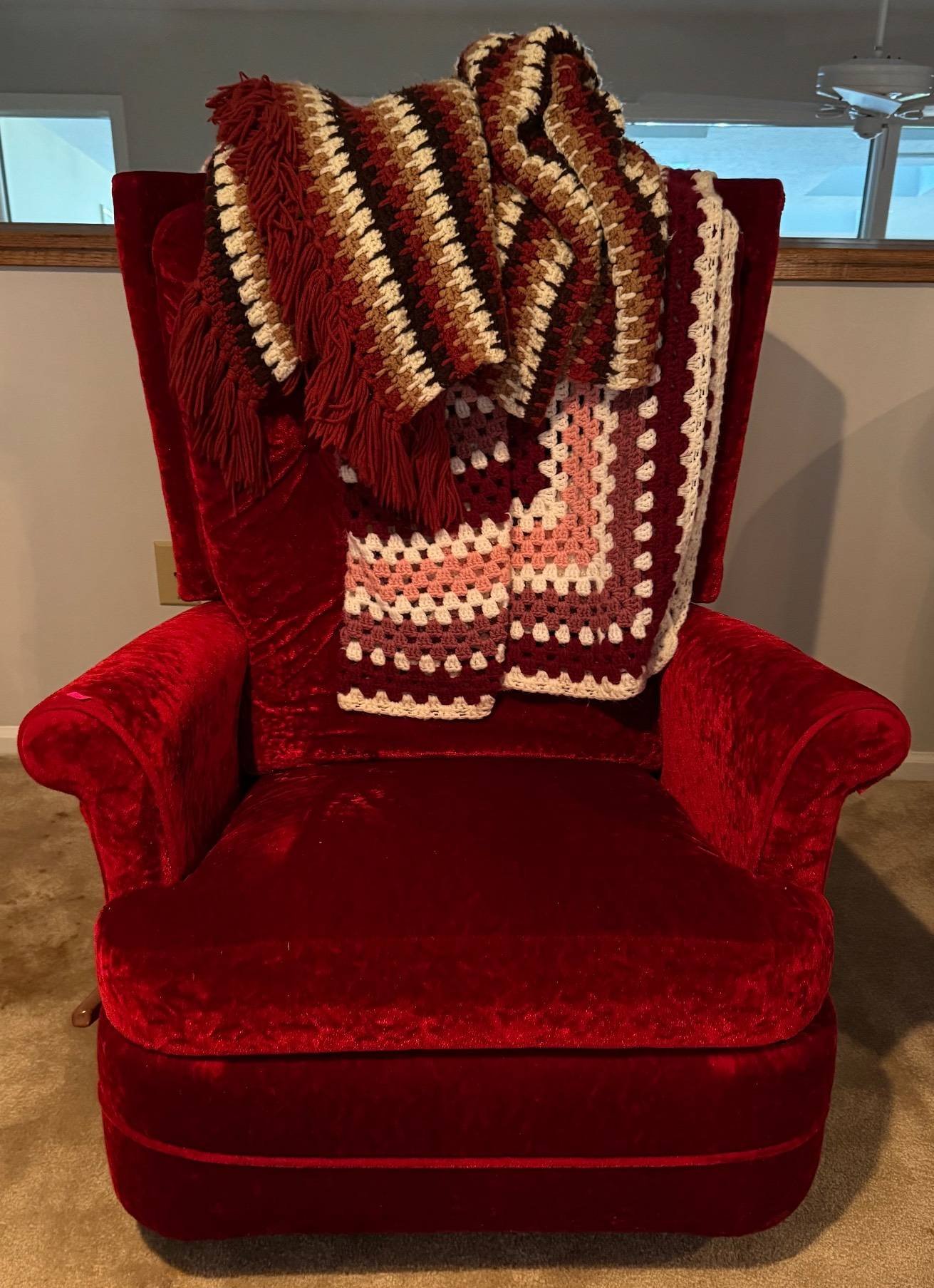 108 Red Upholstered Recliner With (2) Crochet Blankets