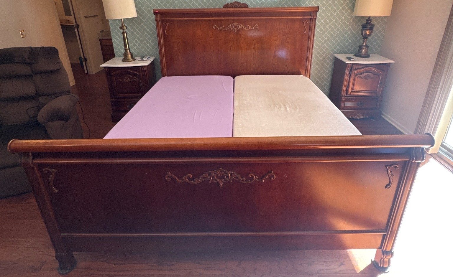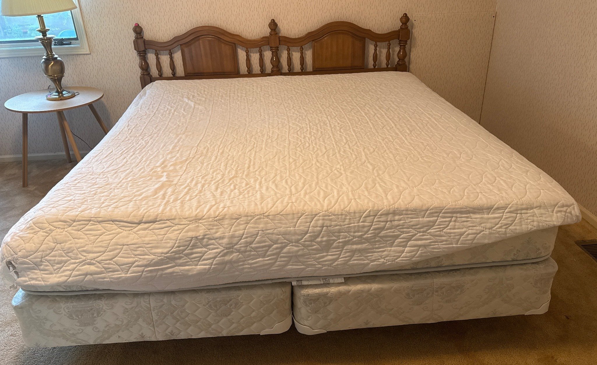114 King-Size Mattress with Two Twin Box Springs and Turned Wood Headboard