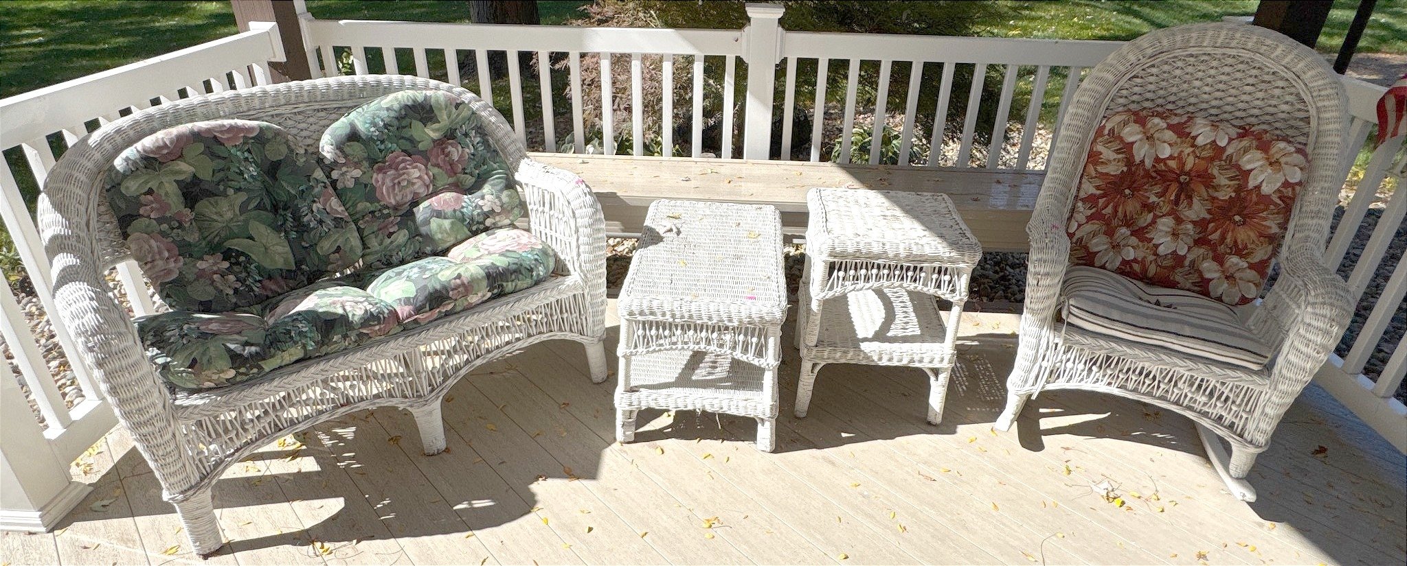 2001 White Wicker Patio Furniture Inc. Rocker, Love Seat, Coffee Table & Side Table