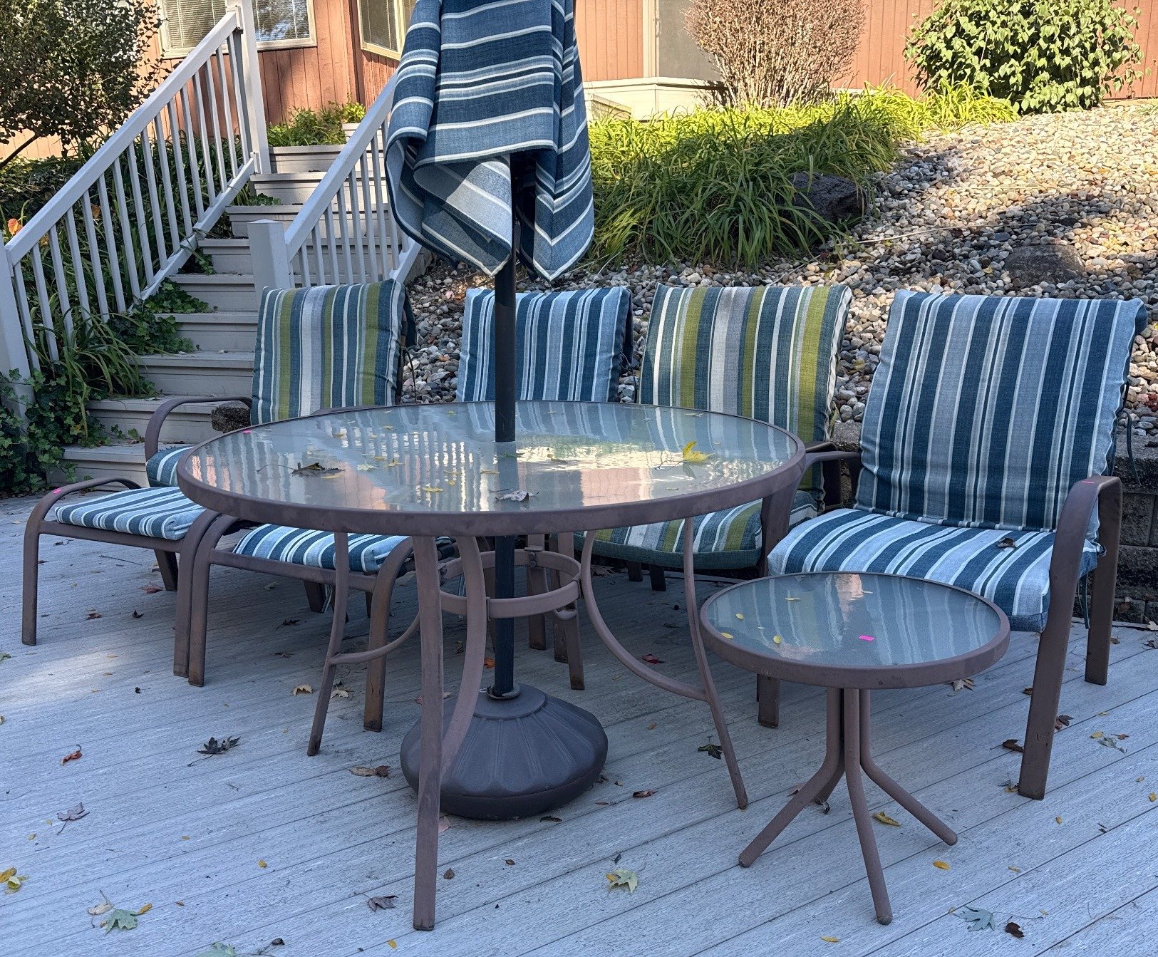 2004 Outdoor Patio Furniture Featuring Glass-Top Table, Small Table, 4 Chairs, and Umbrella