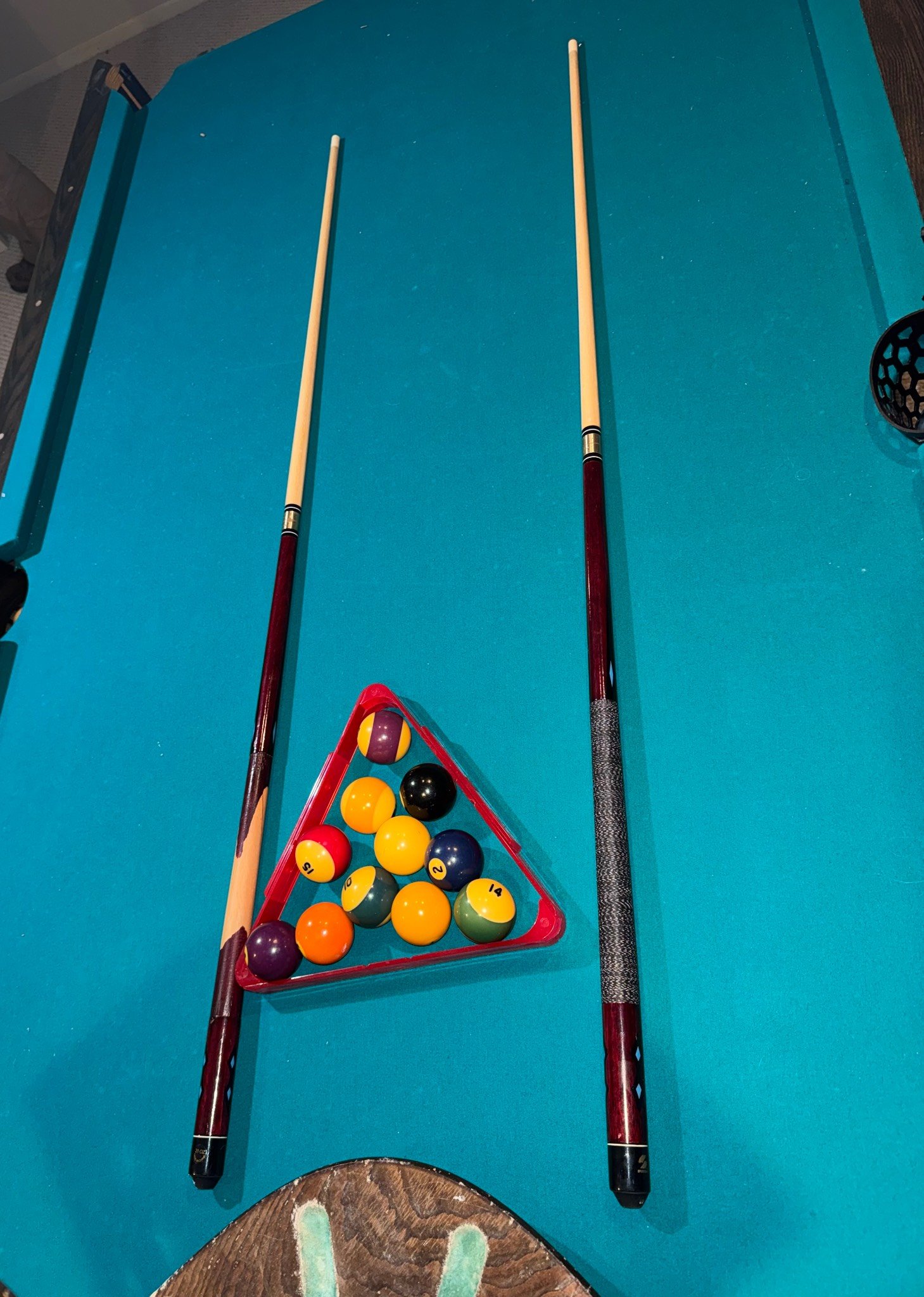 229 Pool Table with Green Felt, Cues, and Balls