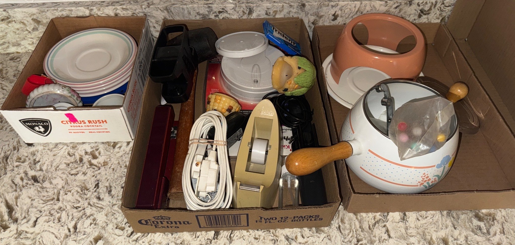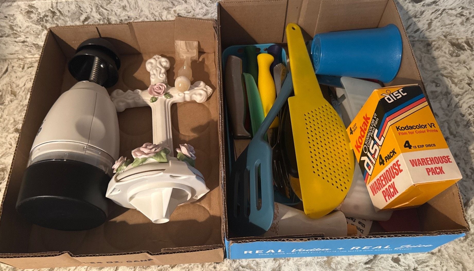 304 Household Items Including Juicer, Boxed Film, Utensils, and Ceramic Cross
