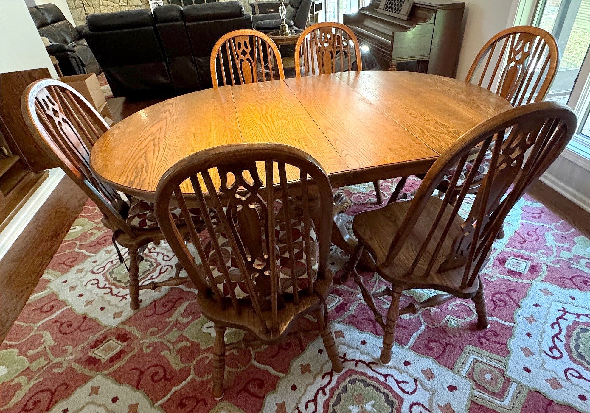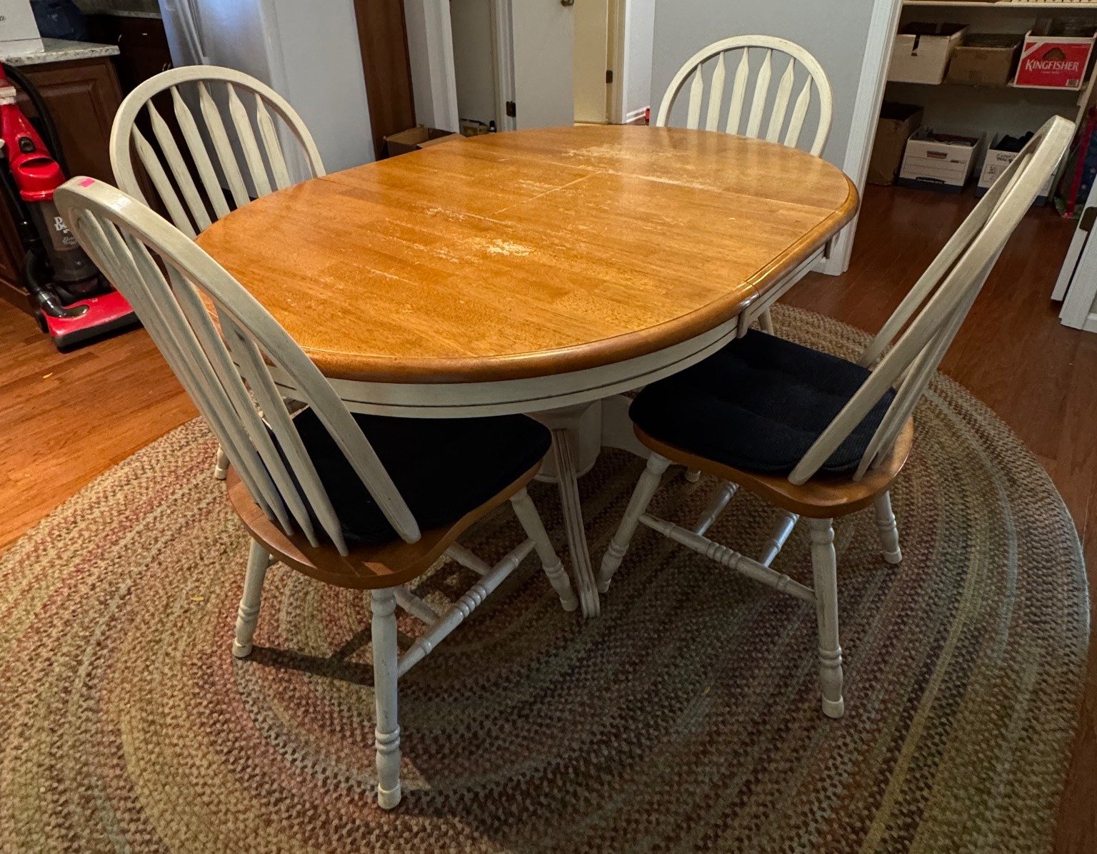 303 Oval Pedestal Dining Table w/ 4 Spindle-Back Chairs, Blue Cushions