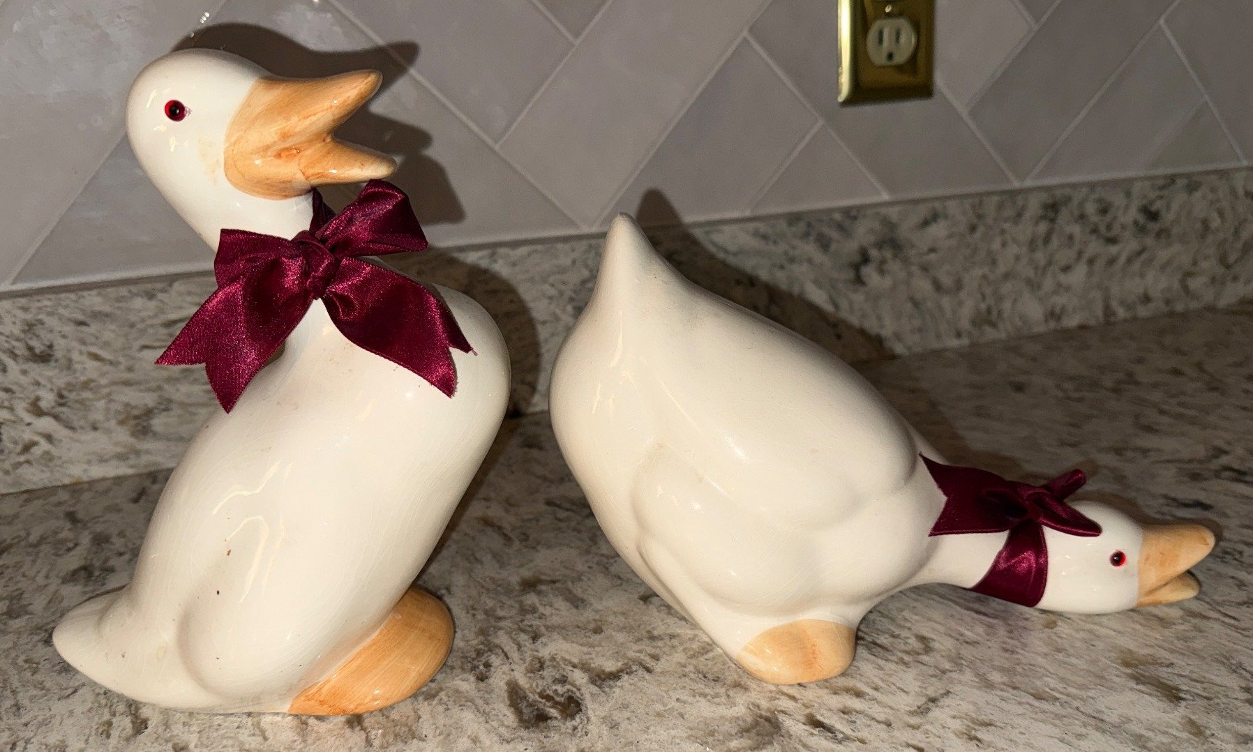305 Ceramic Goose Figurines with Red Ribbon Accents