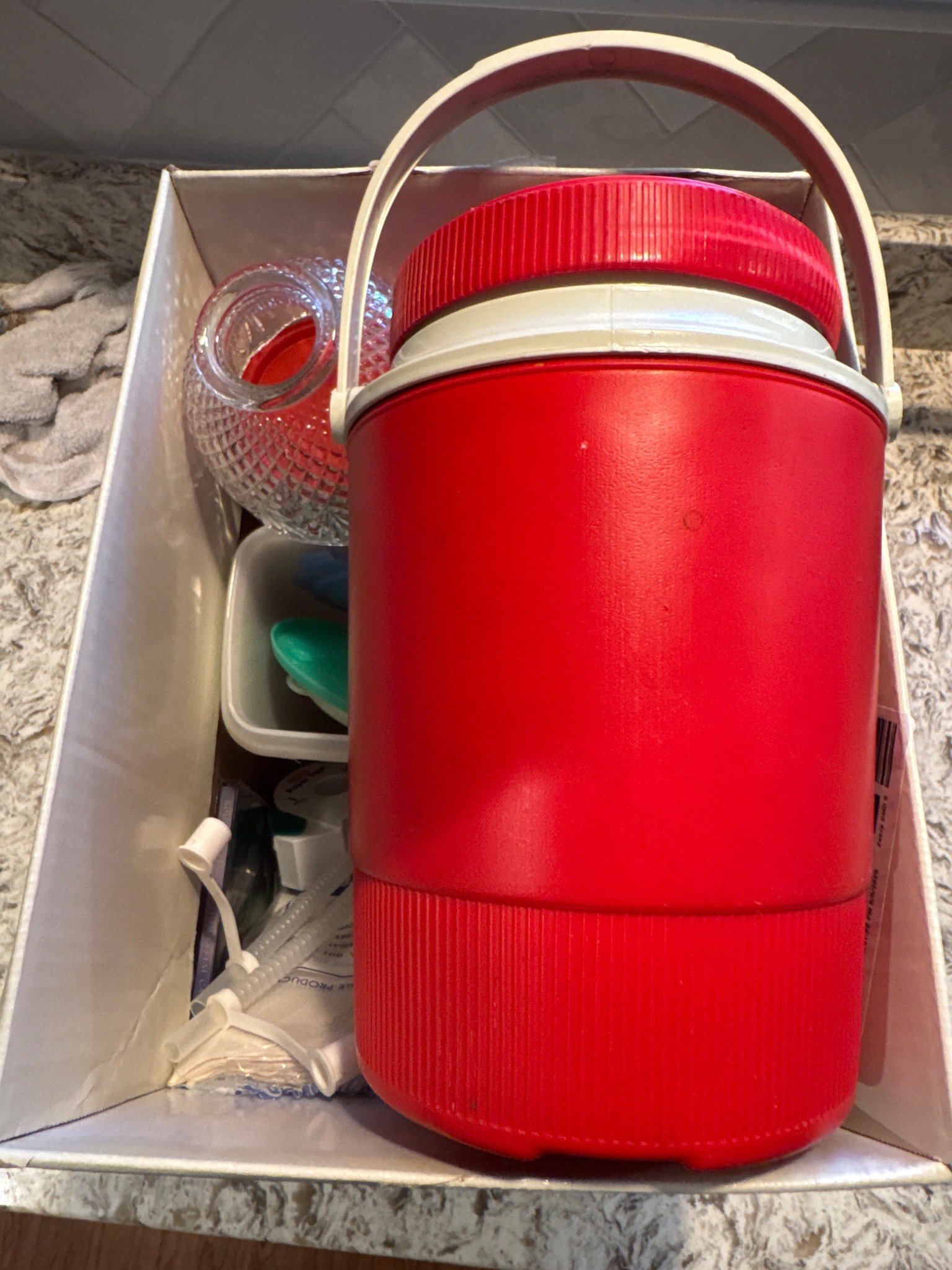 312 Box Lot With Plastic Cooler, Table Cloth, and Assorted Items