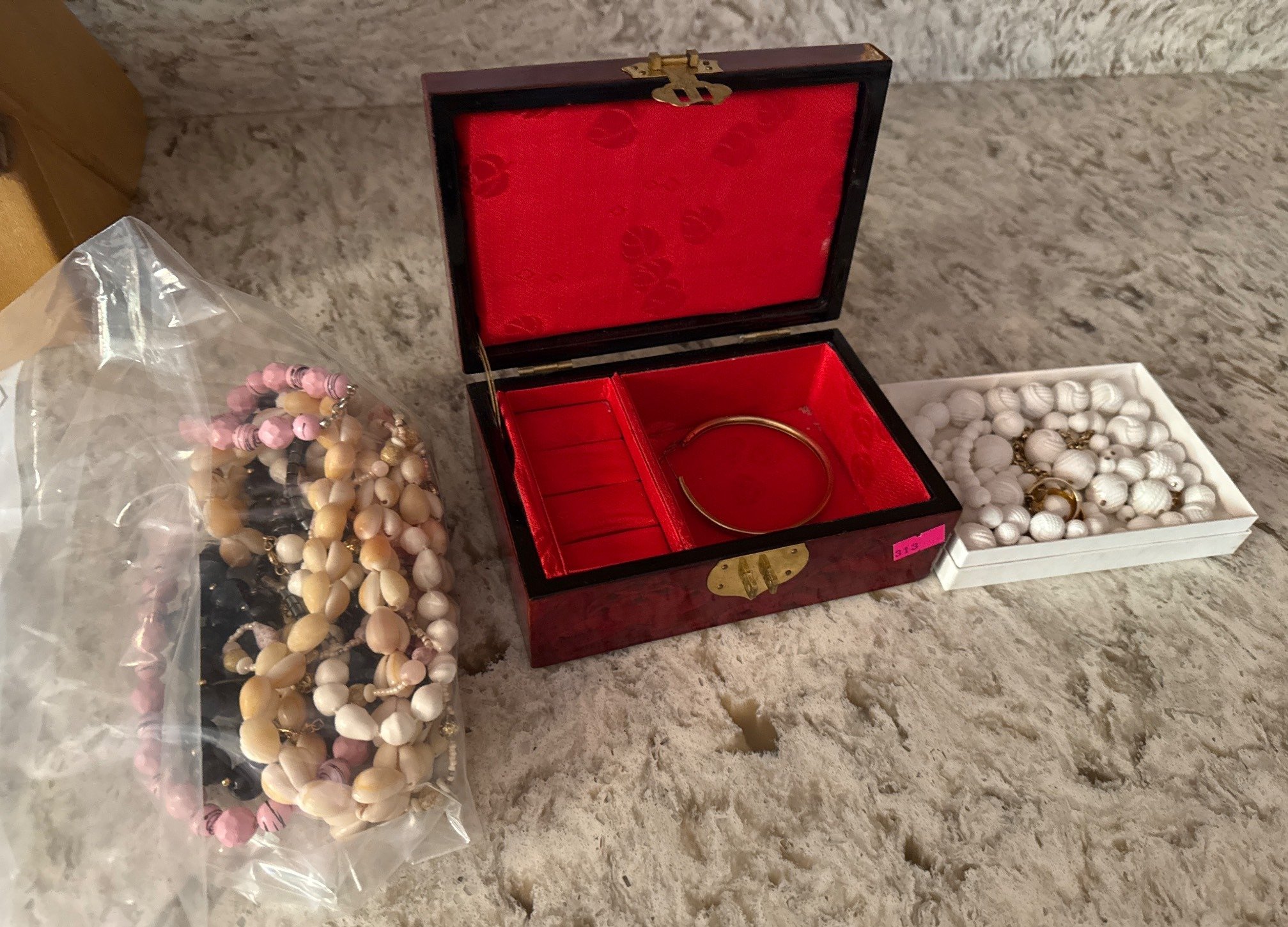 313 Lacquered Jewelry Box with Oriental Design and Assorted Beaded Jewelry