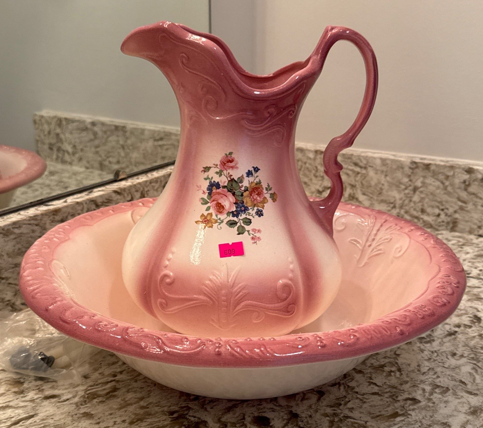 609 Pink and White Ceramic Pitcher and Bowl with Floral Decoration
