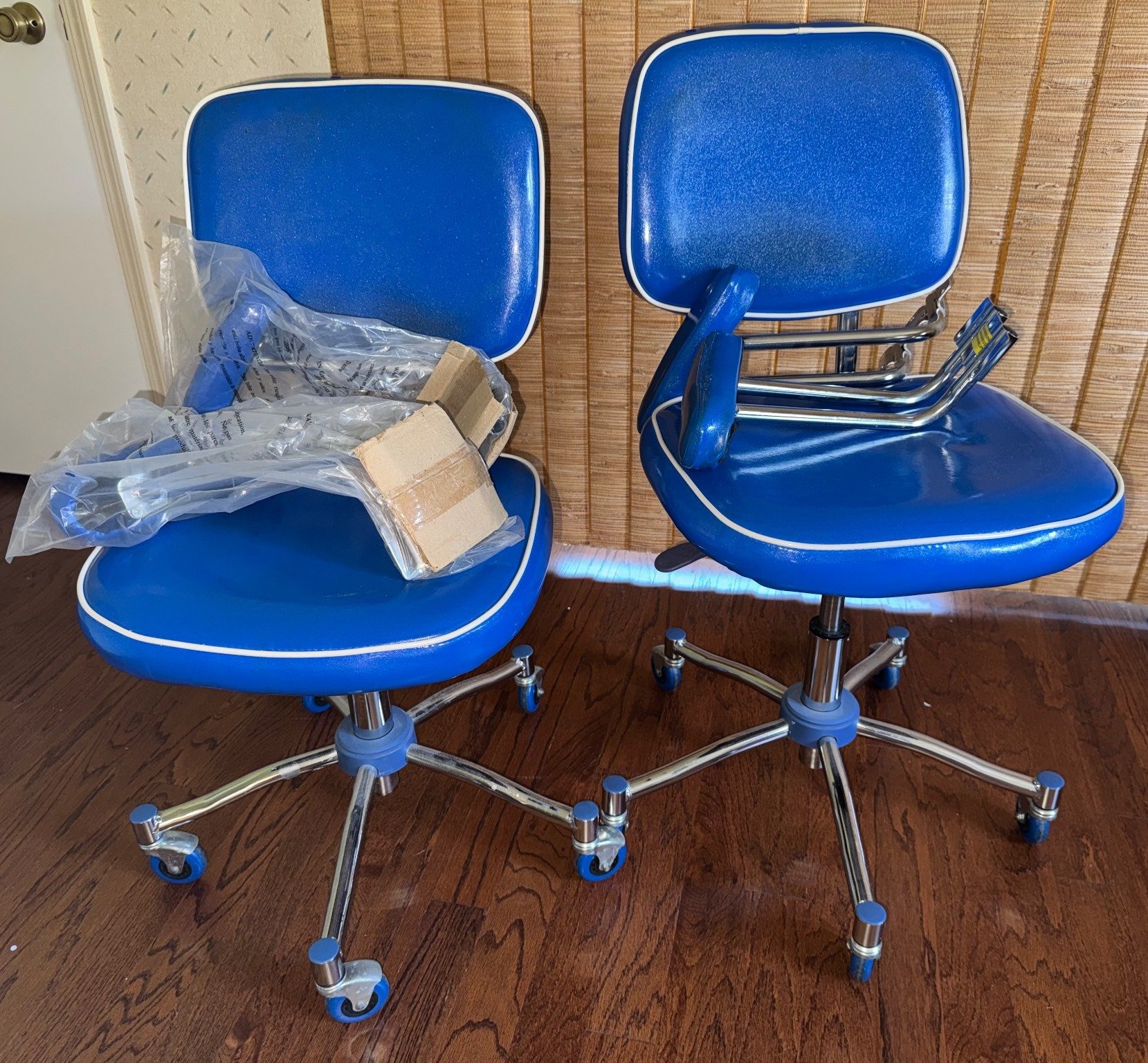709 (2) Adjustable Office Chairs with Blue Vinyl Upholstery & Chrome Base, 35”