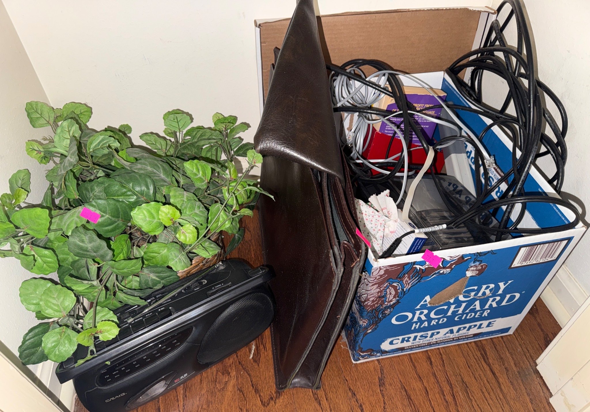 713 Lot with Faux Plant, Craig Radio, Briefcase, and Boxed Assorted Items