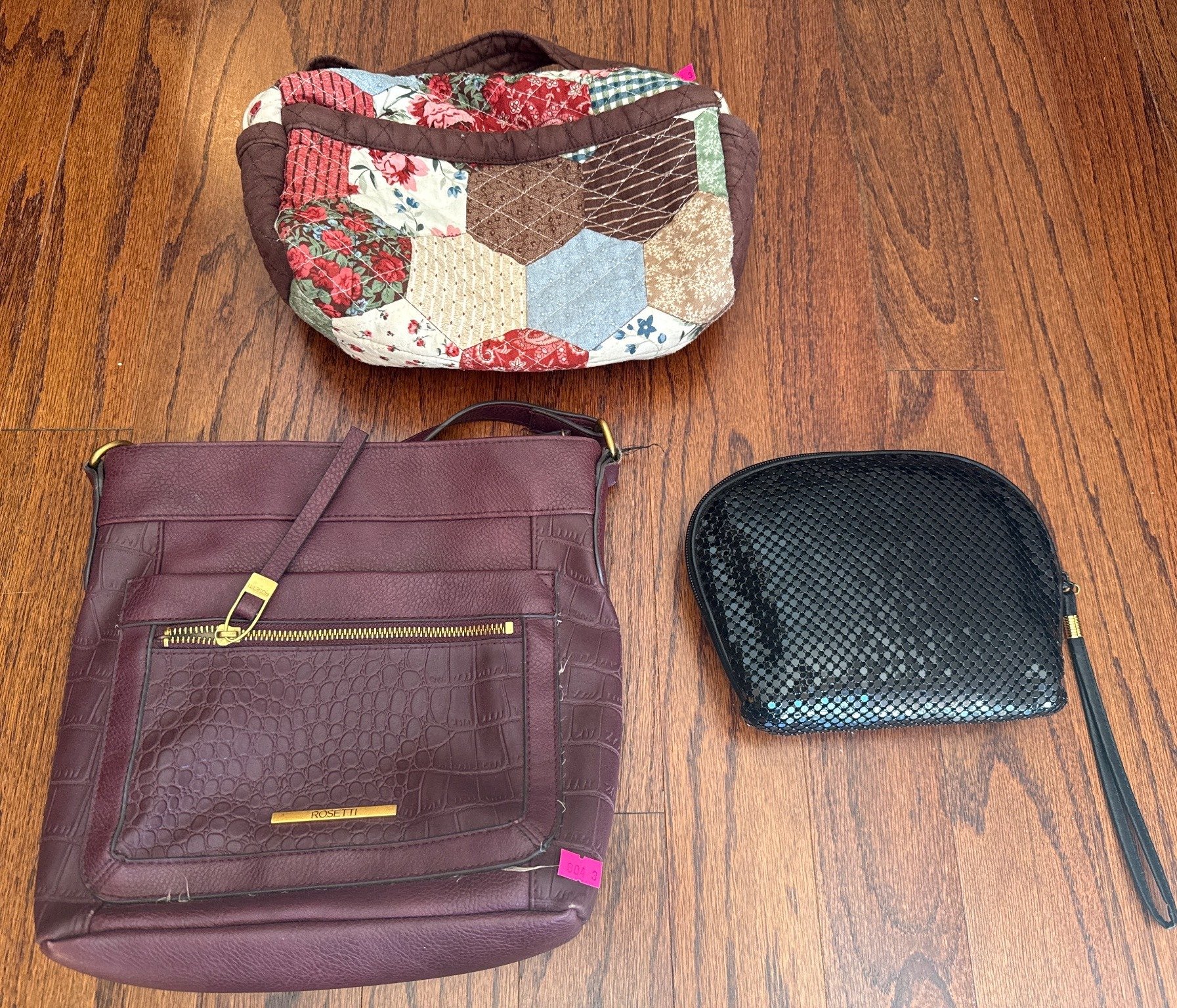 804 Rosetti Shoulder Bag, Quilted Hexagon Pattern Bag, and Black Mesh Wristlet