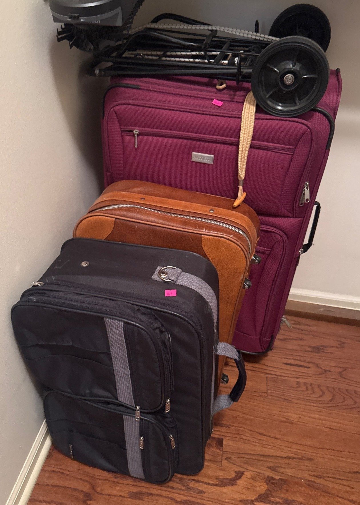 812 Three Pieces of Luggage in Various Materials and Rolling Cart