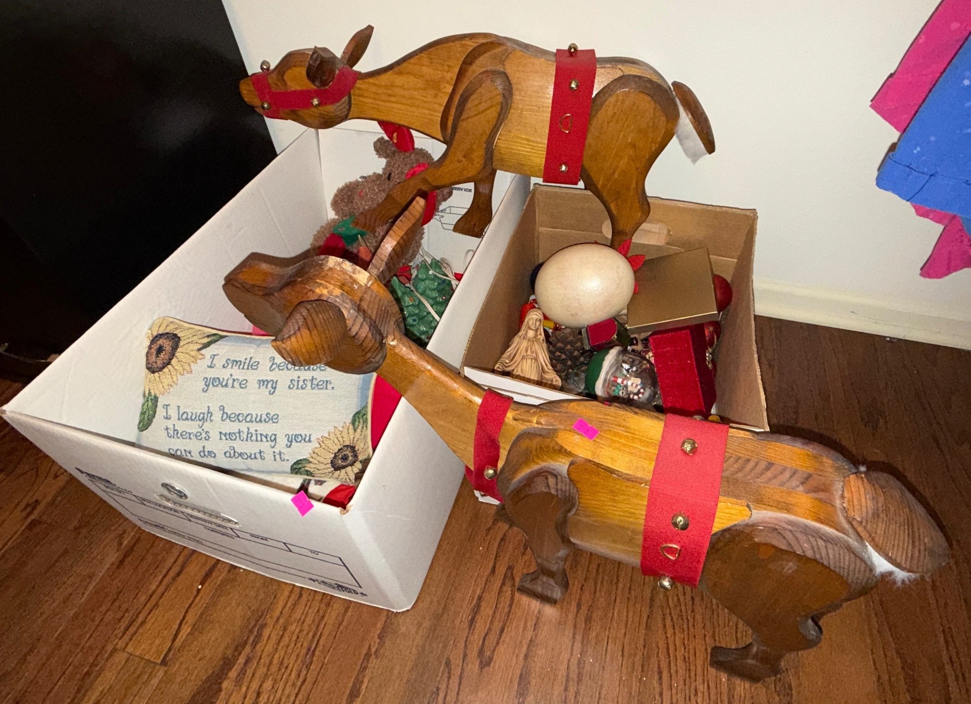 818 Carved Reindeer with Red Accents and Holiday Decorations