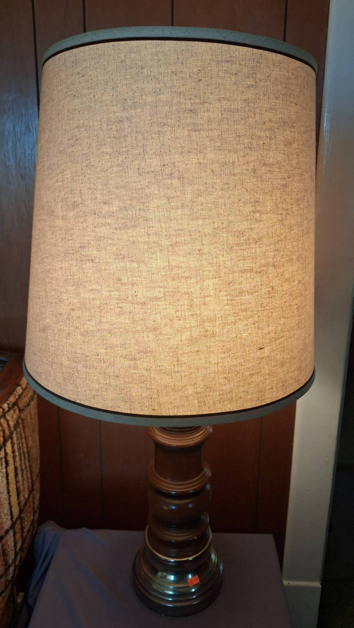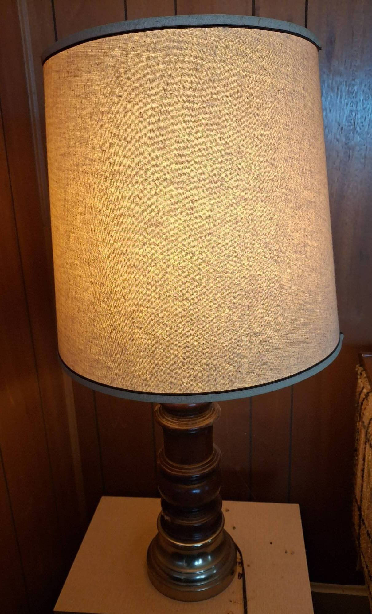 102 Table Lamp with Turned Brown Base and Fabric Shade 34? hgt. (chip in Lamp Base, works)