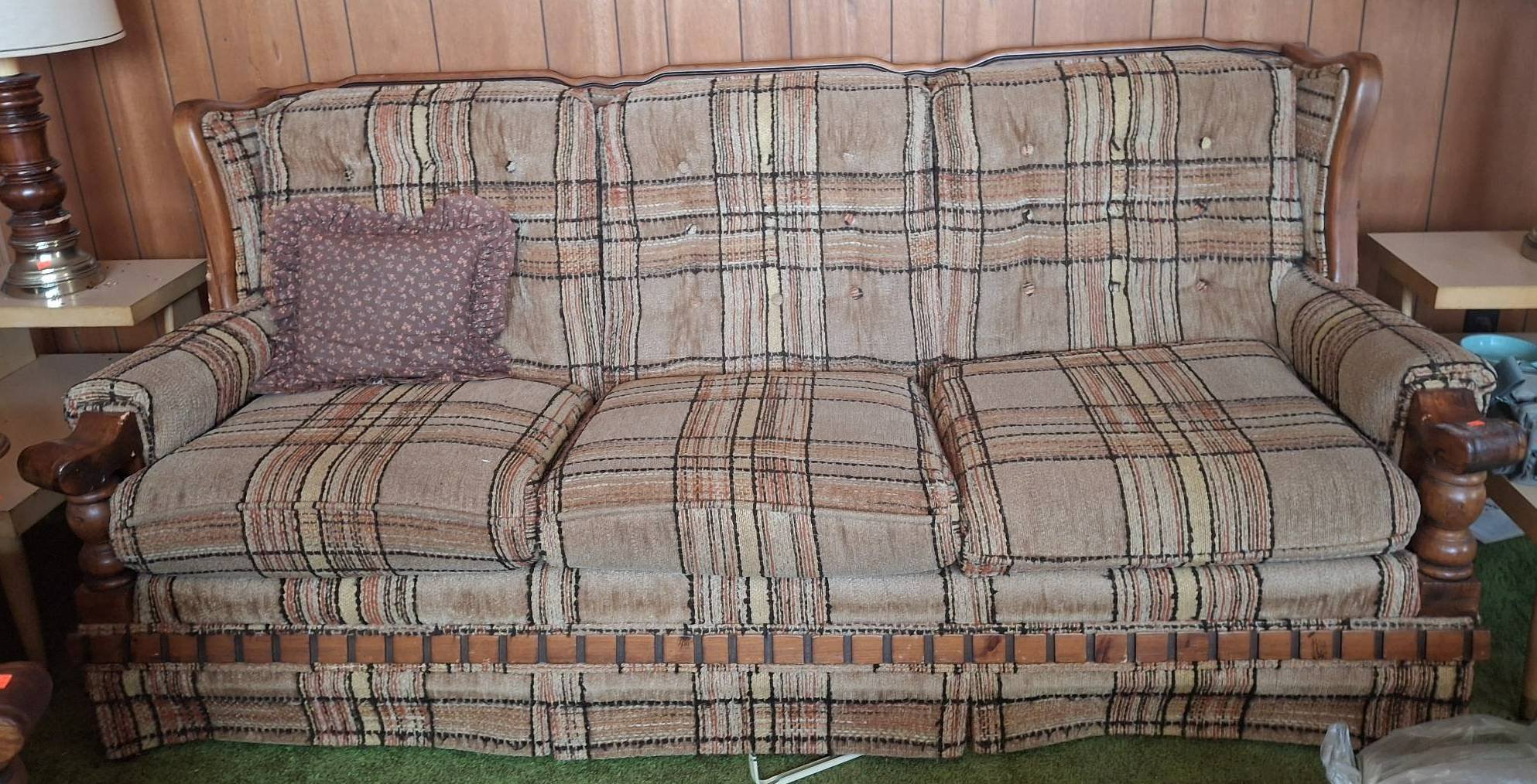 106 Plaid Upholstered Sofa with Carved Wood Frame and Armrests 81?x34?x36? (chips in Wood arm rest)