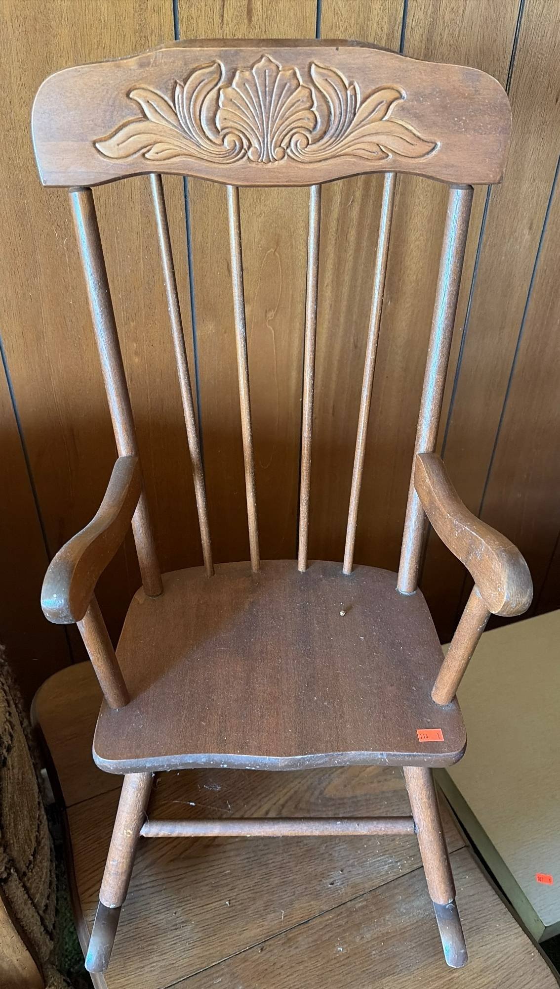 114 Childs Spindle Back Rocking Chair with Carved Floral Backrest, 10” floor to seat