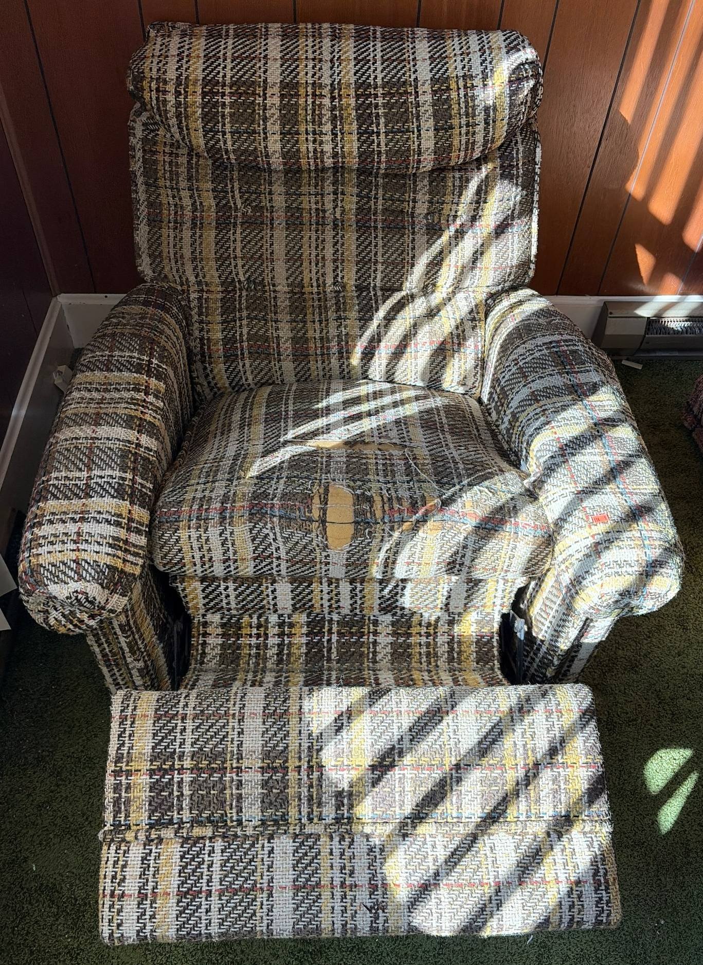 112 Chair with Plaid Upholstery and Matching Footrest (visible wear)