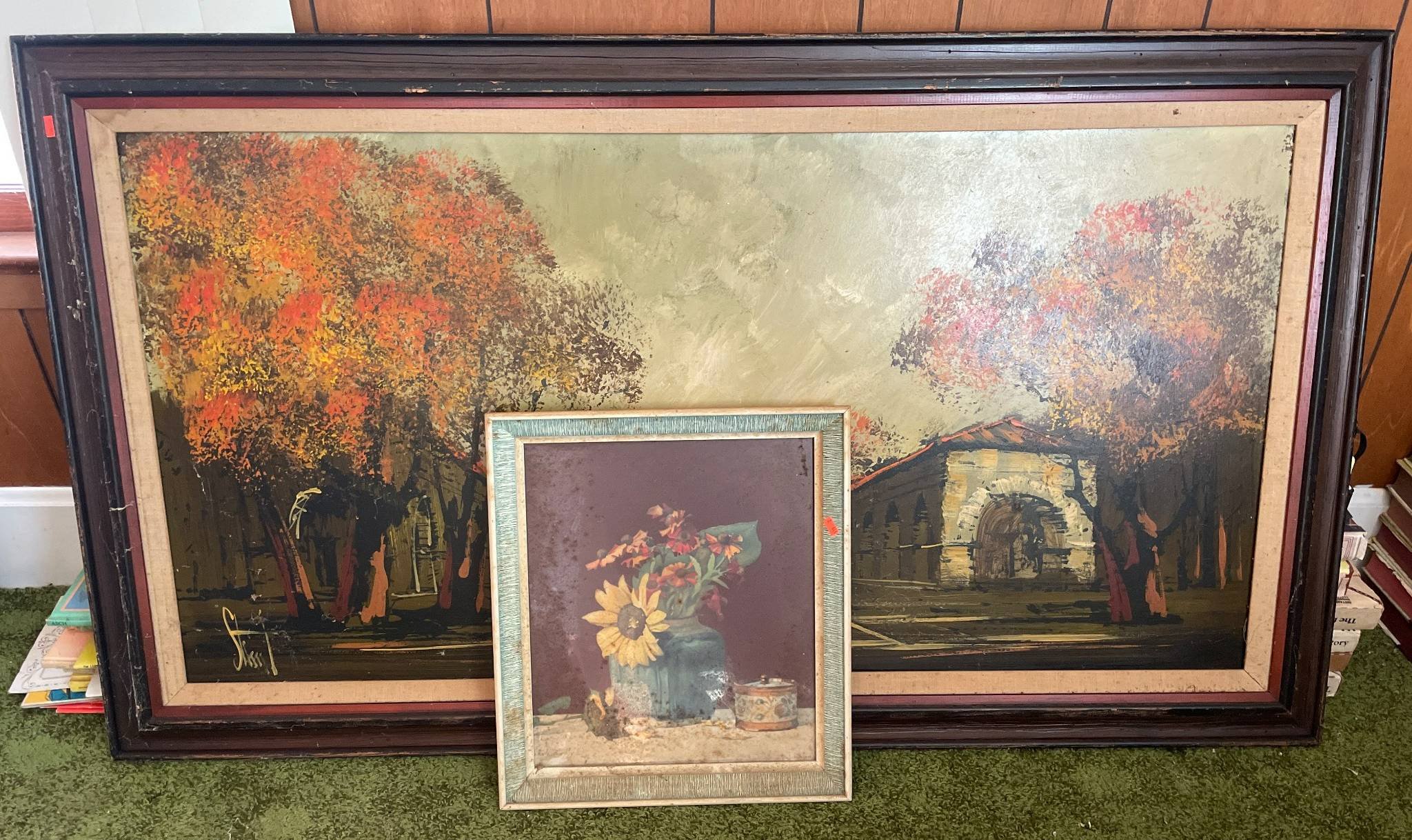 119 Framed Vanguard Studios Inc. 1967 Landscape Painting by Stuart and Floral Still Life Print by Charles Murphy, 55”x32” and 17.5”x15.5”