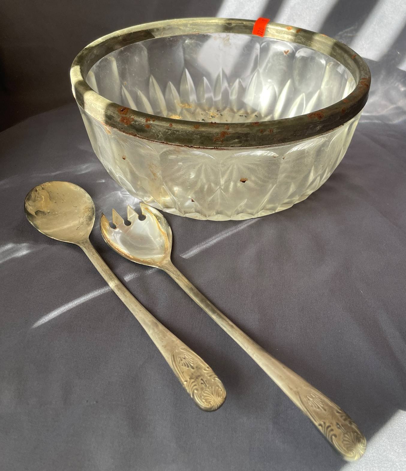 120 Glass Bowl with Silver-Plated Rim and Italian Silver-Plated Serving Utensils 9?