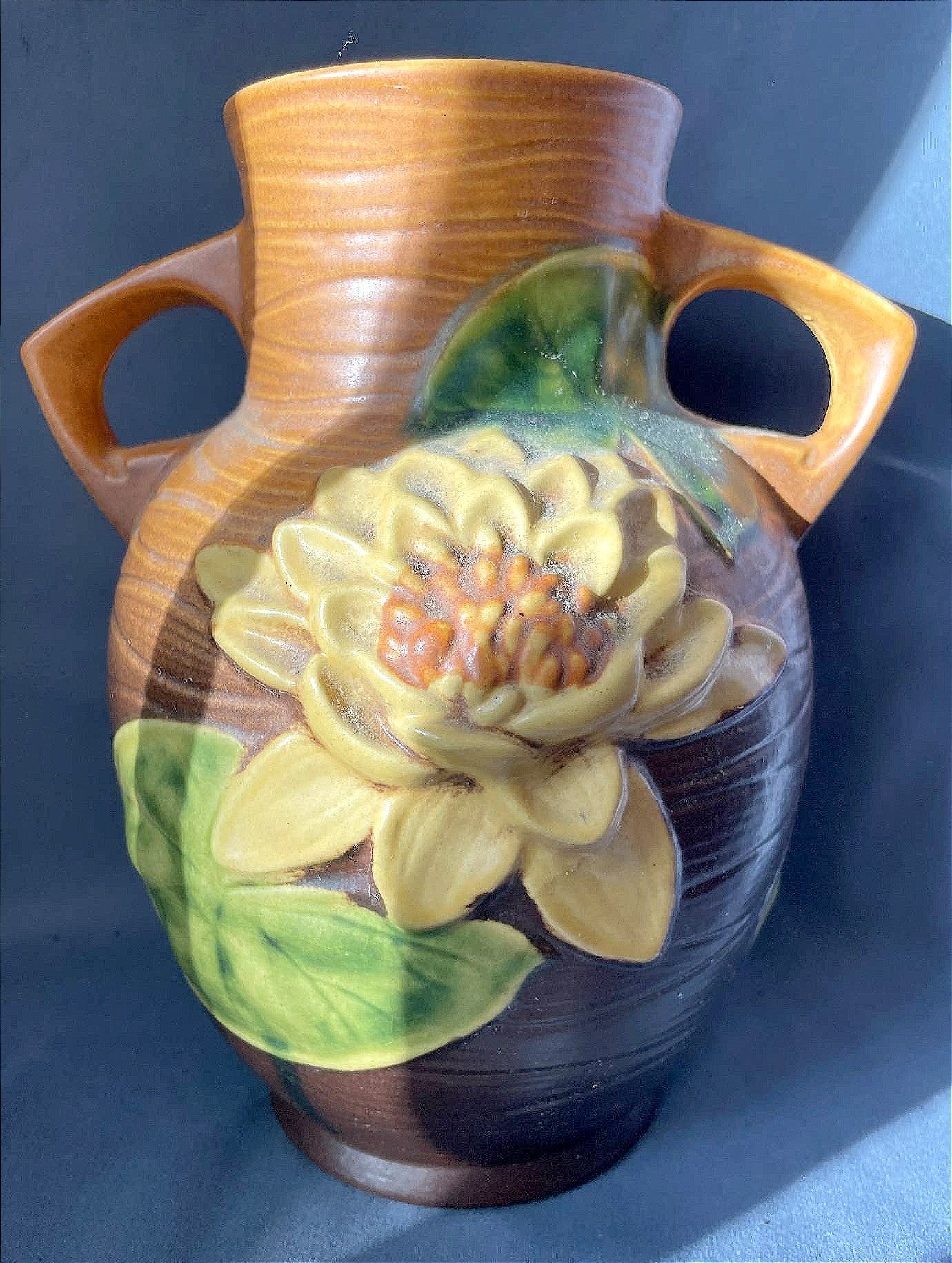 121 Roseville Pottery Water Lily Vase with Dual Handles, 9”H, chip on base