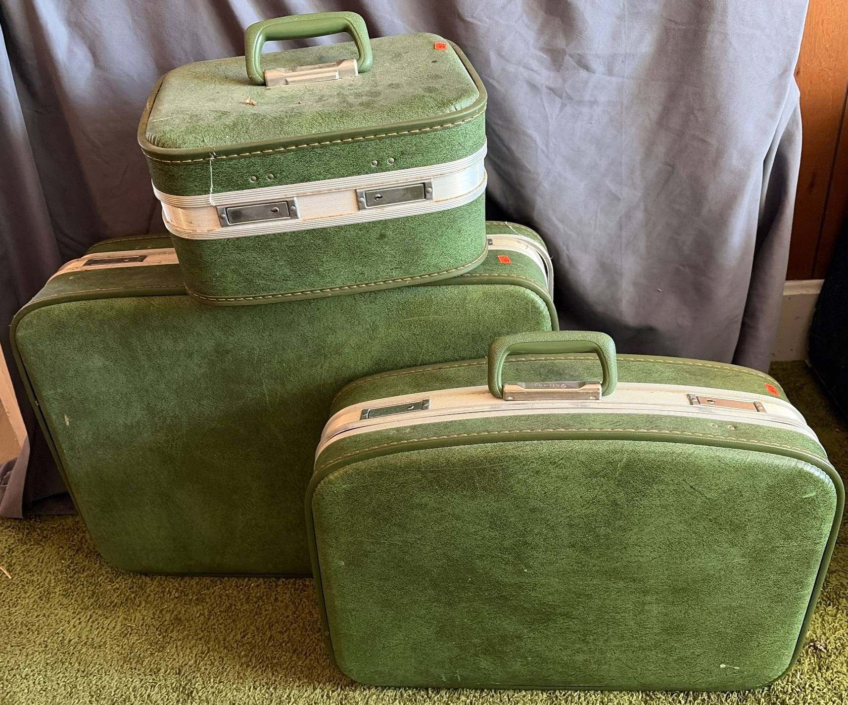 138 3pc Gateway Green Luggage with Yellow Interiors, 24”x18”, 14”x10” (visible wear)