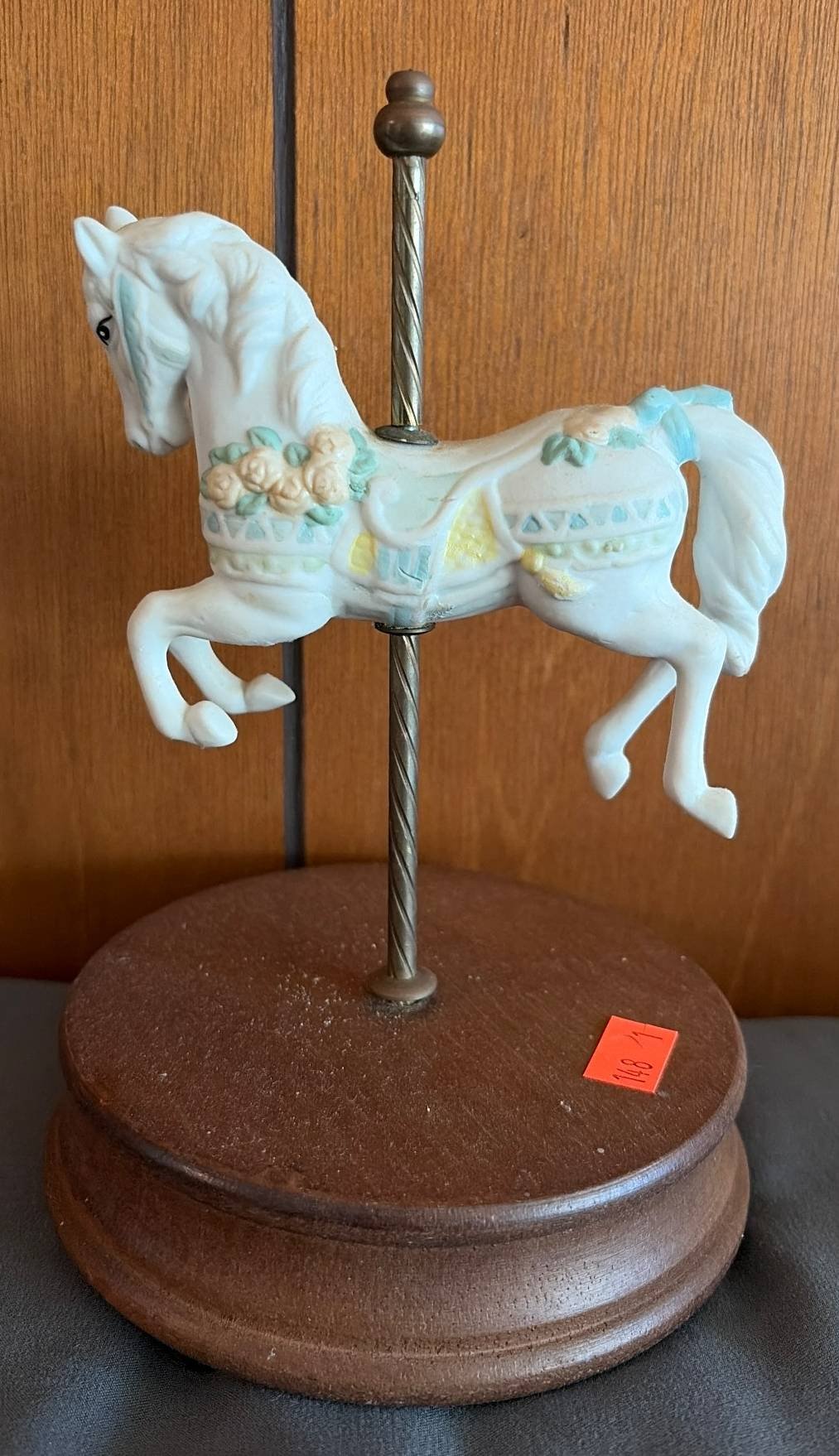 148 Porcelain Carousel Horse Figurine on Round Wood Base, 7”H