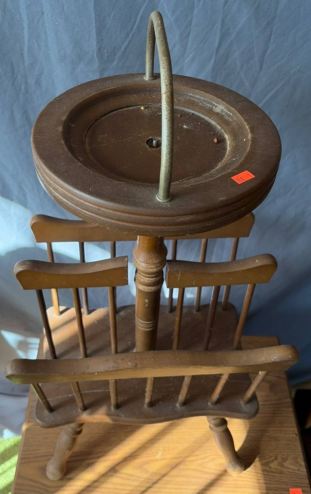 150 Wood Magazine Holder with Circular Handle and Spindled Sides, 14”x11”x28”