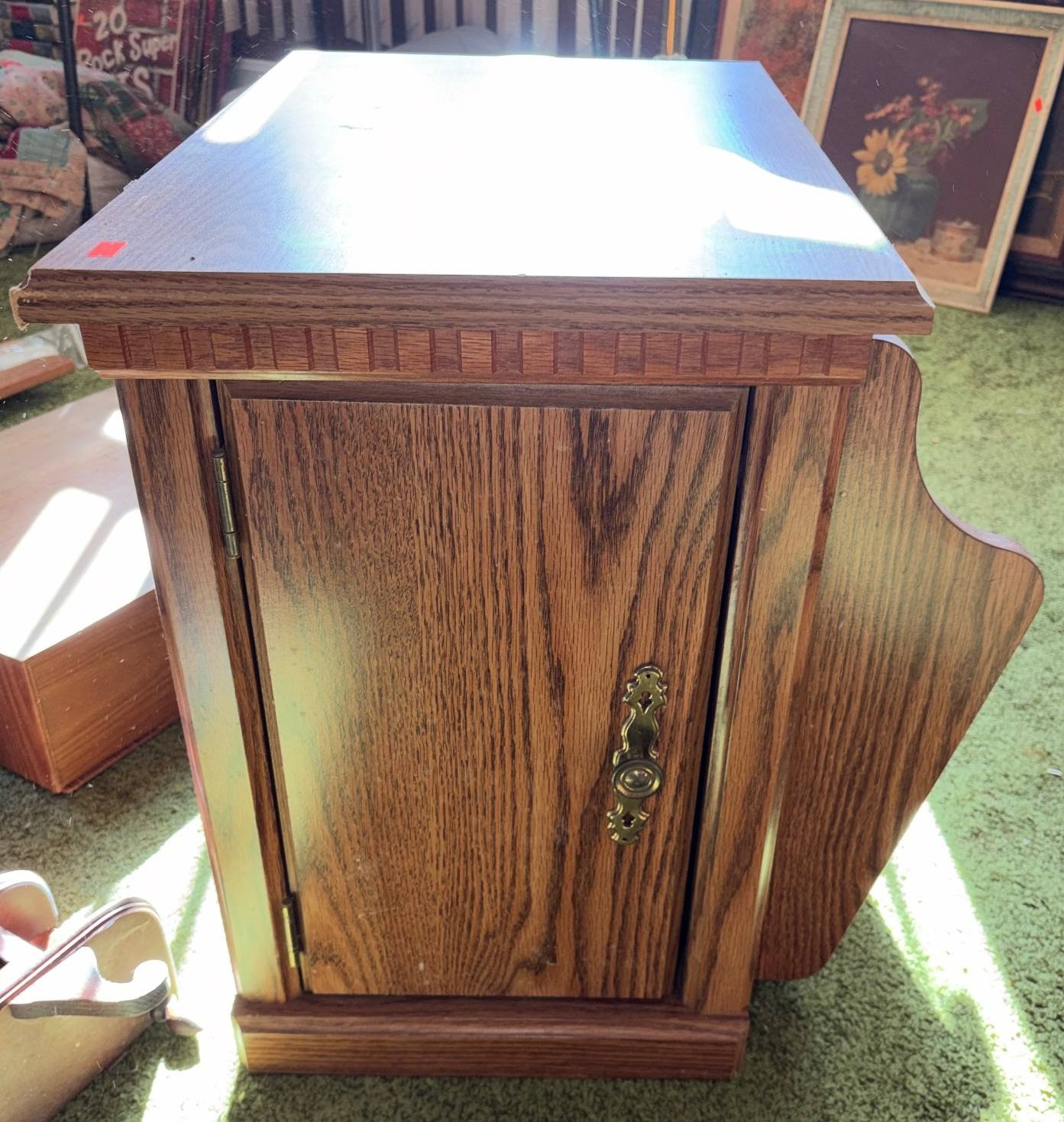 153 Wood Trinket Cabinet with Glass Door and Ornamental Top, Made in Taiwan, 14”x5”x17”