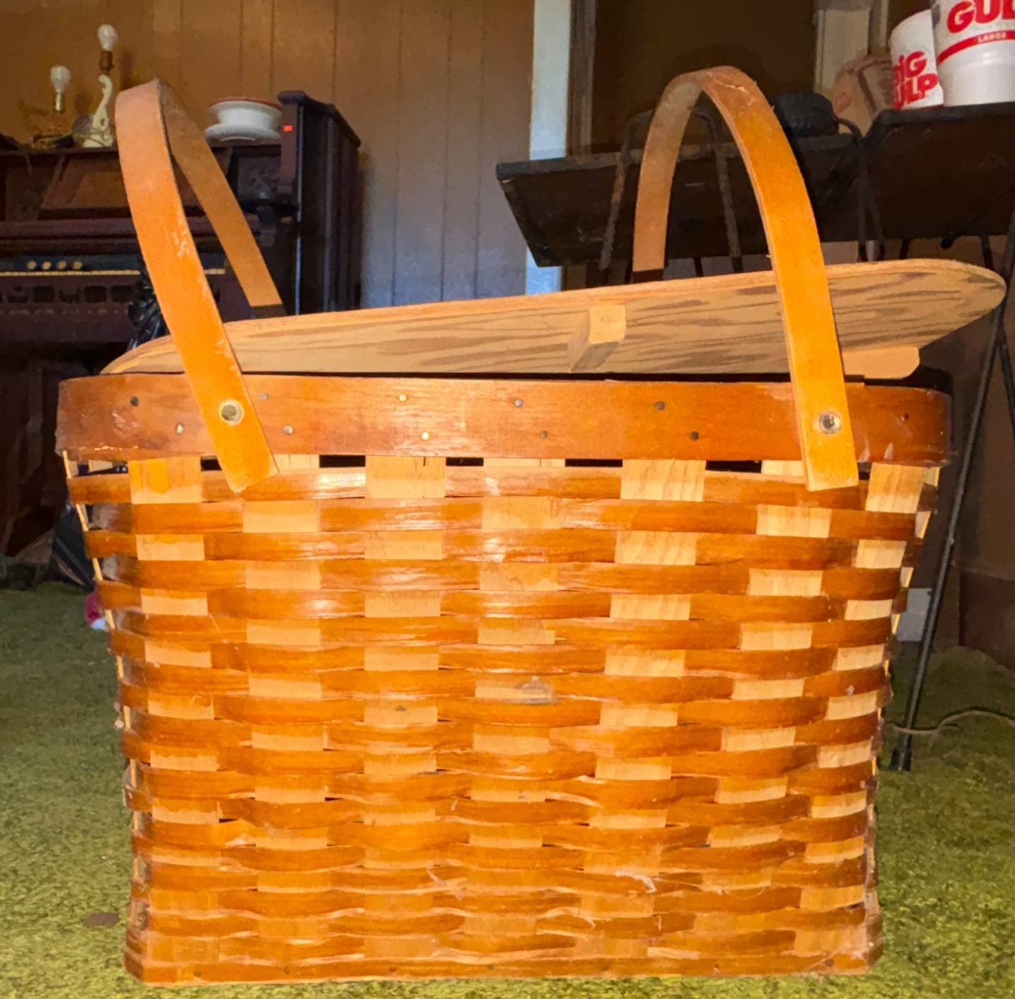 201 Woven Basket with Hinged Wood Lid & Dual Handles 19.5”L x 13.2”W