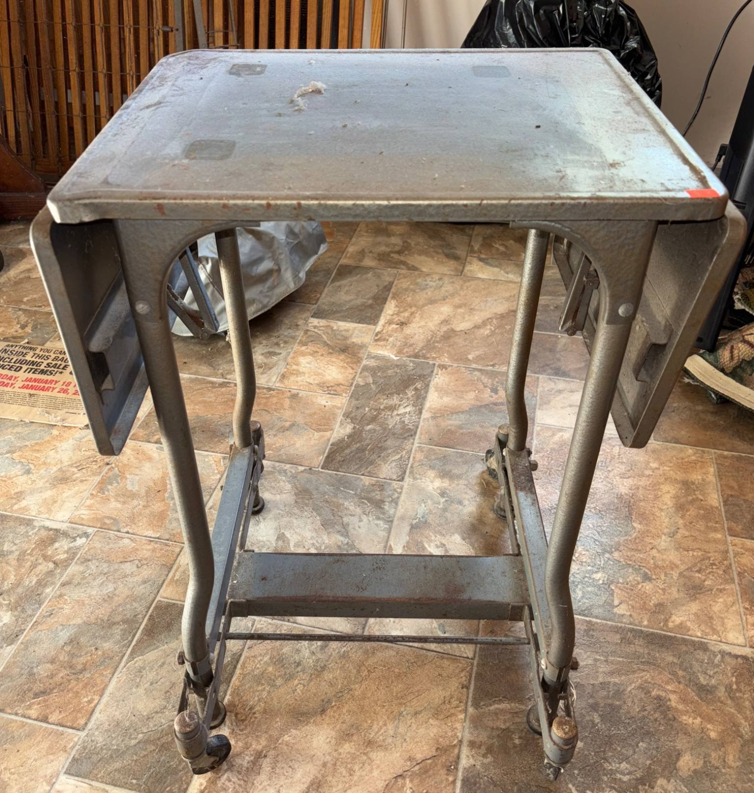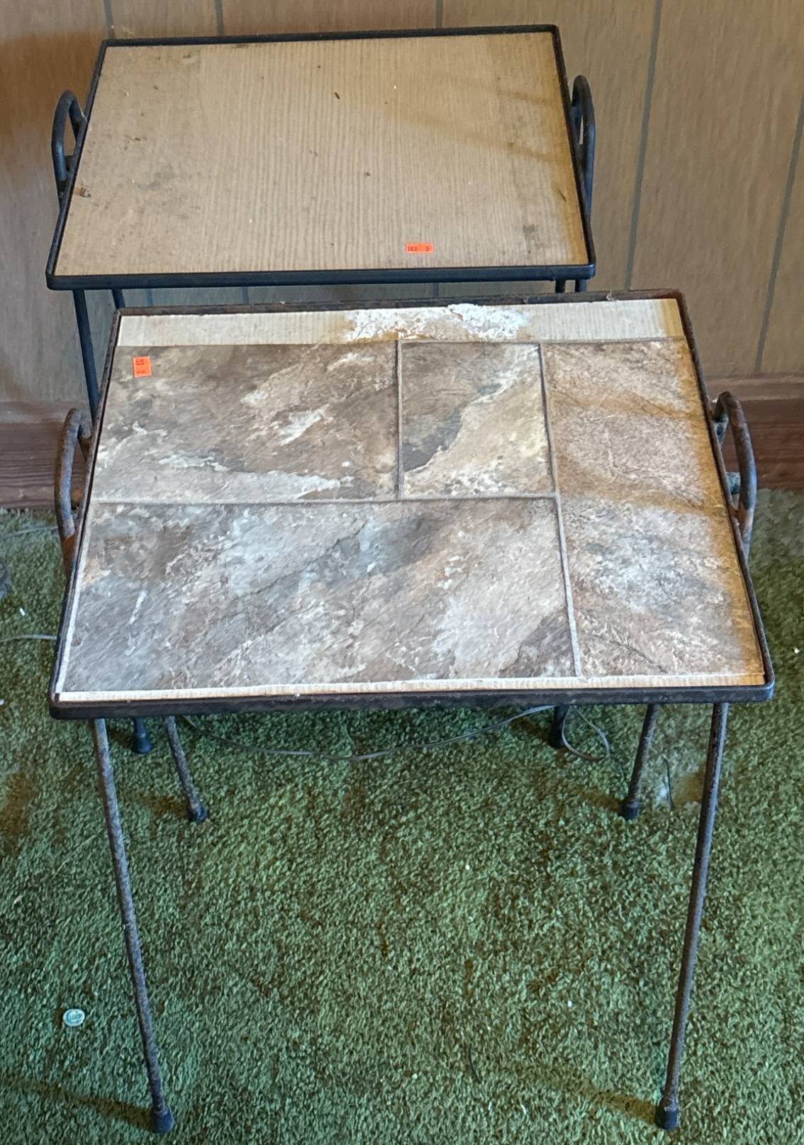 203 2 – Metal Tray-Top Table with Handles & Foldable Legs, one with tile top (shows wear)